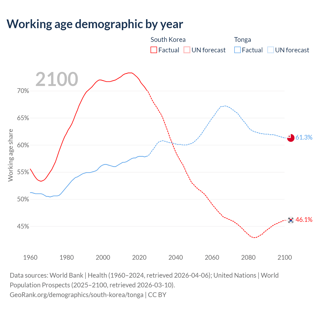 - South Korea has 36.2M working age adults (aged 15-64) vs 59.8K in Tonga.