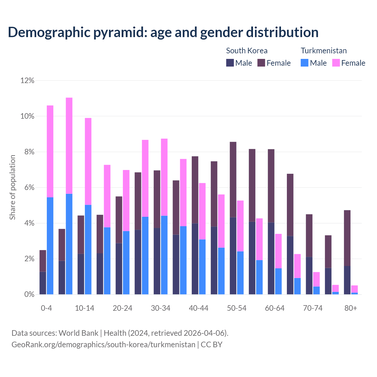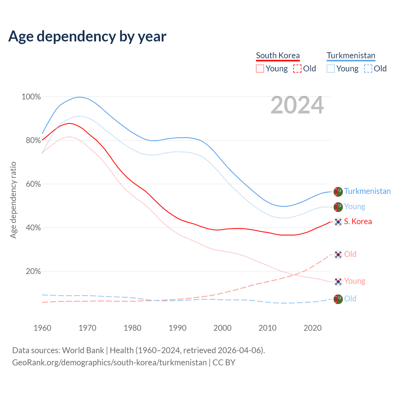 - South Korea is ranked 10/196 by median age (oldest to youngest) vs 119/196 for Turkmenistan.