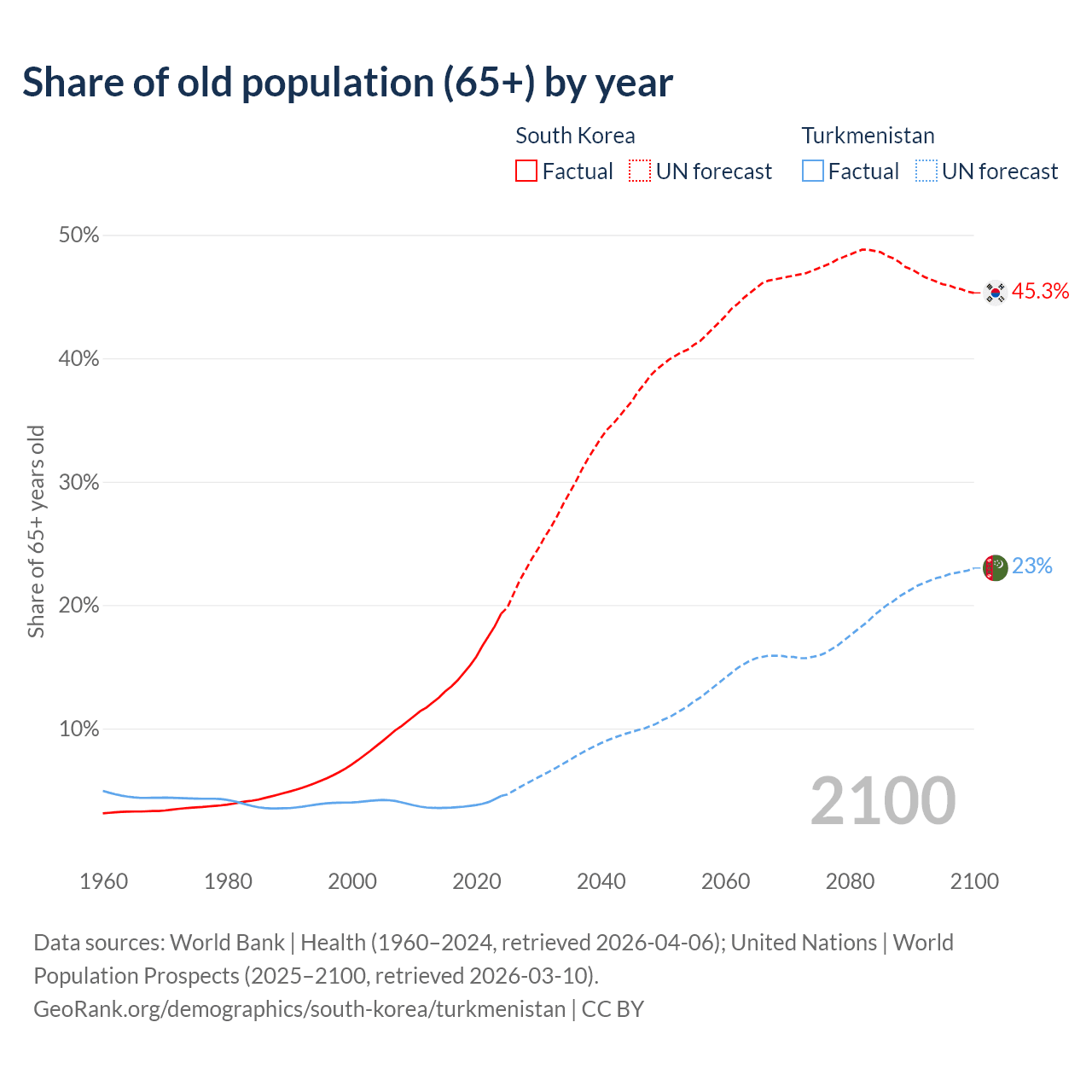 The share of older people aged 65 and over is 19.3% in South Korea and 4.53% in Turkmenistan. Life expectancy in South Korea compared to Turkmenistan .
