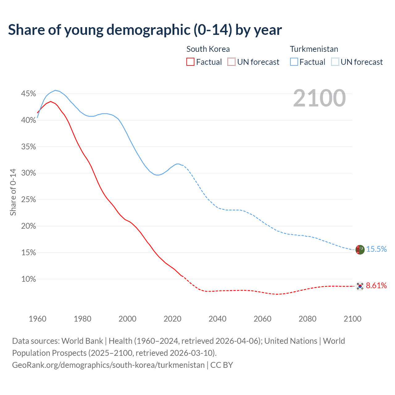 - The share of young demographic (0-15 years old) in South Korea is 10.6% vs 31.5% in Turkmenistan.