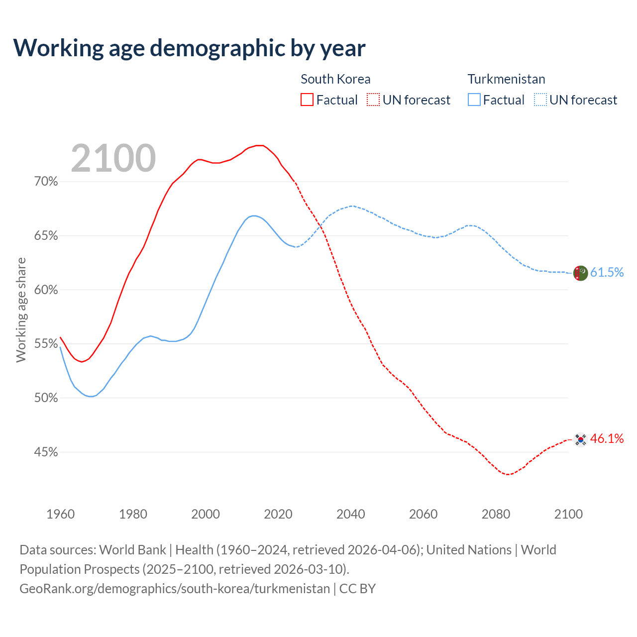- South Korea has 36.2M working age adults (aged 15-64) vs 4.97M in Turkmenistan.