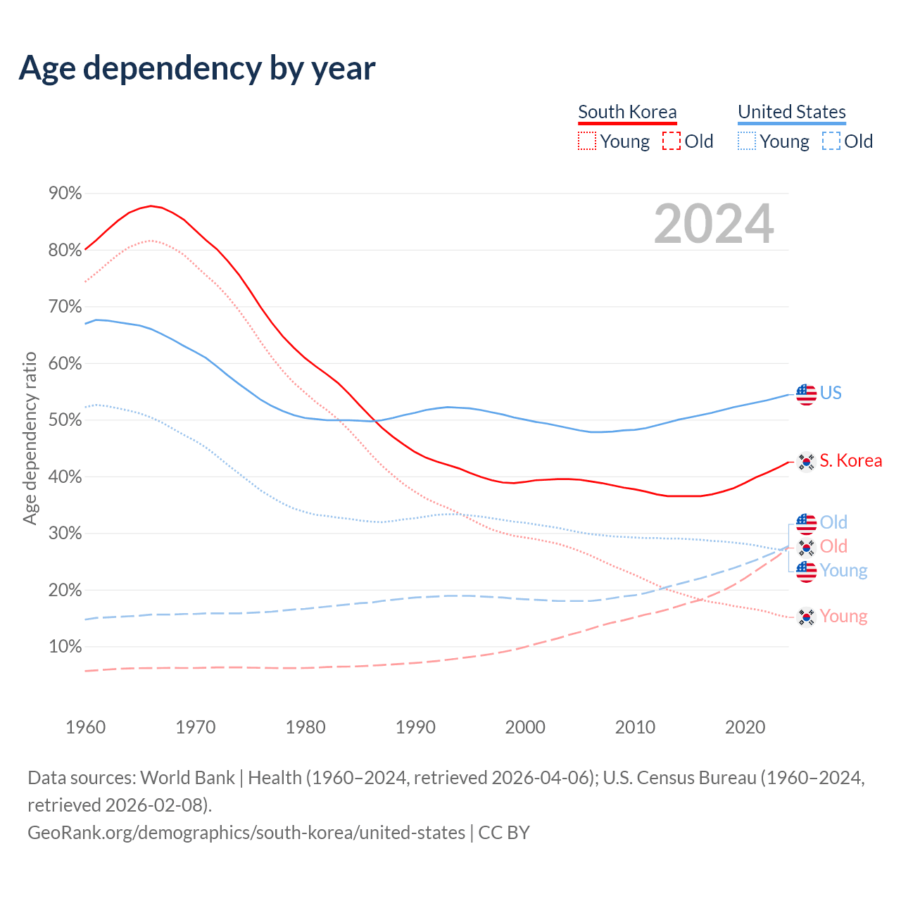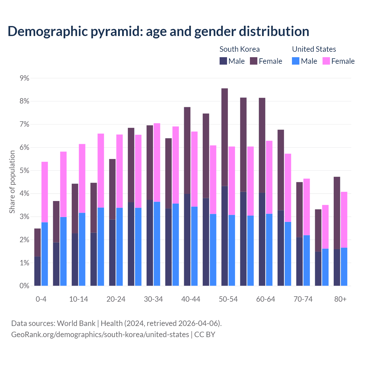 - South Korea is ranked 10/196 by median age (oldest to youngest) vs 50/196 for the United States.