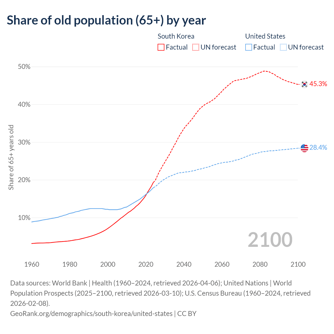 The share of older people aged 65 and over is 19.3% in South Korea and 17.9% in the United States. Life expectancy in South Korea compared to the United States .