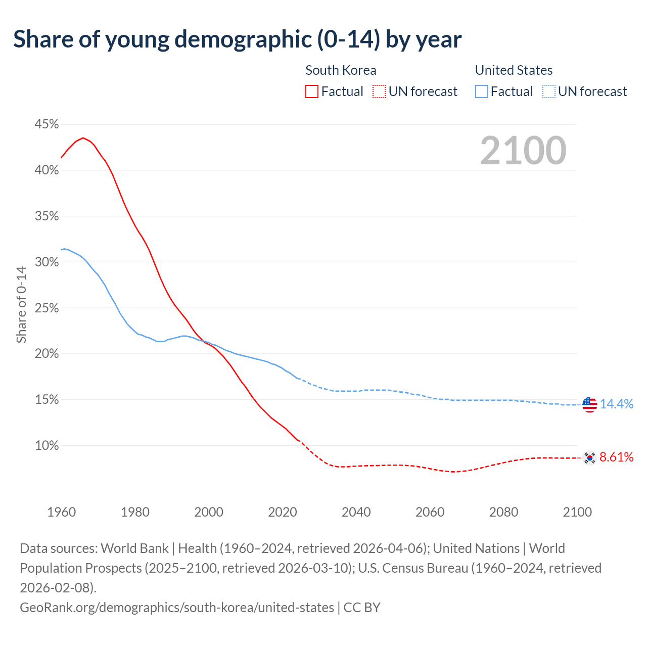 - The share of young demographic (0-15 years old) in South Korea is 10.6% vs 17.3% in the United States.