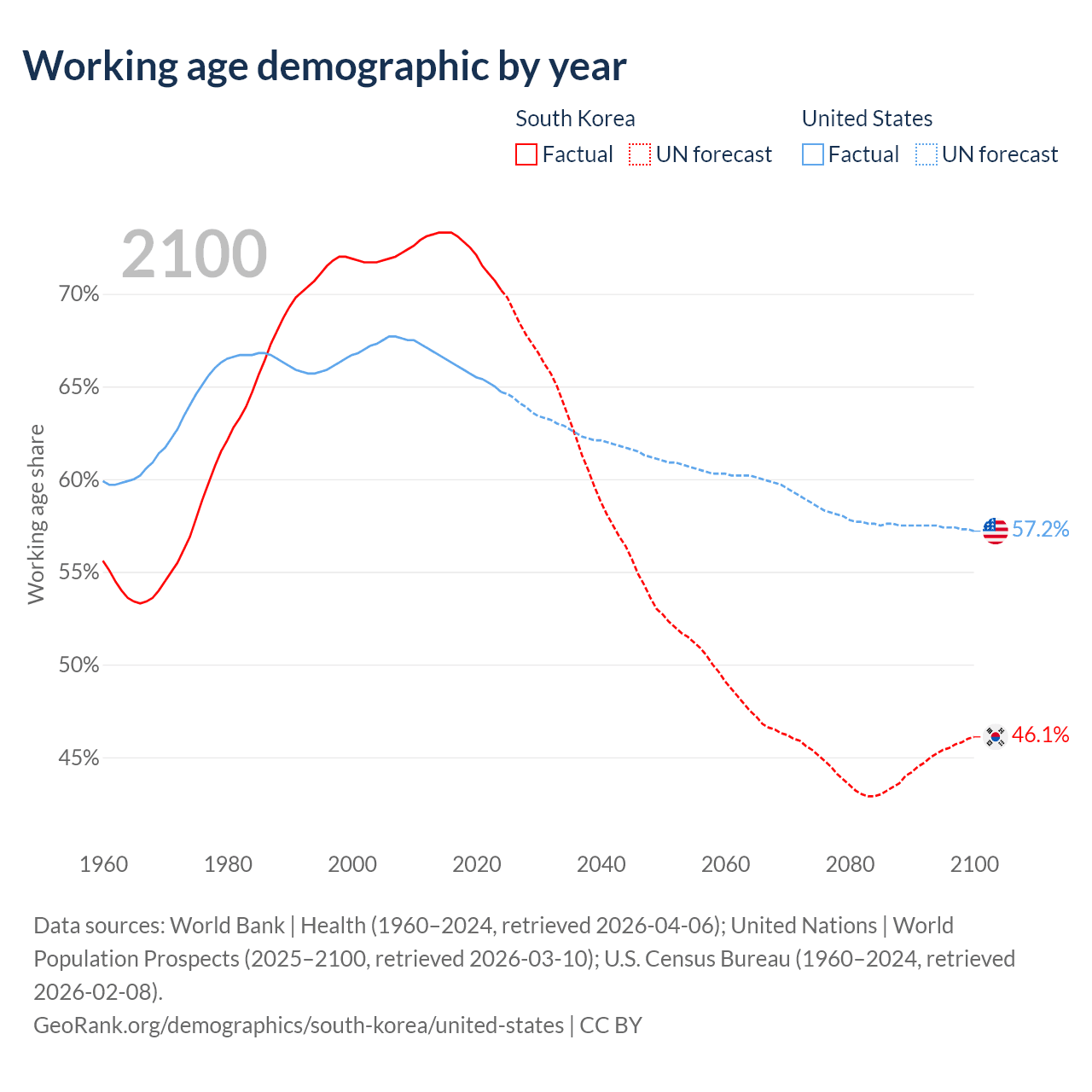 - South Korea has 36.2M working age adults (aged 15-64) vs 223M in the United States.
