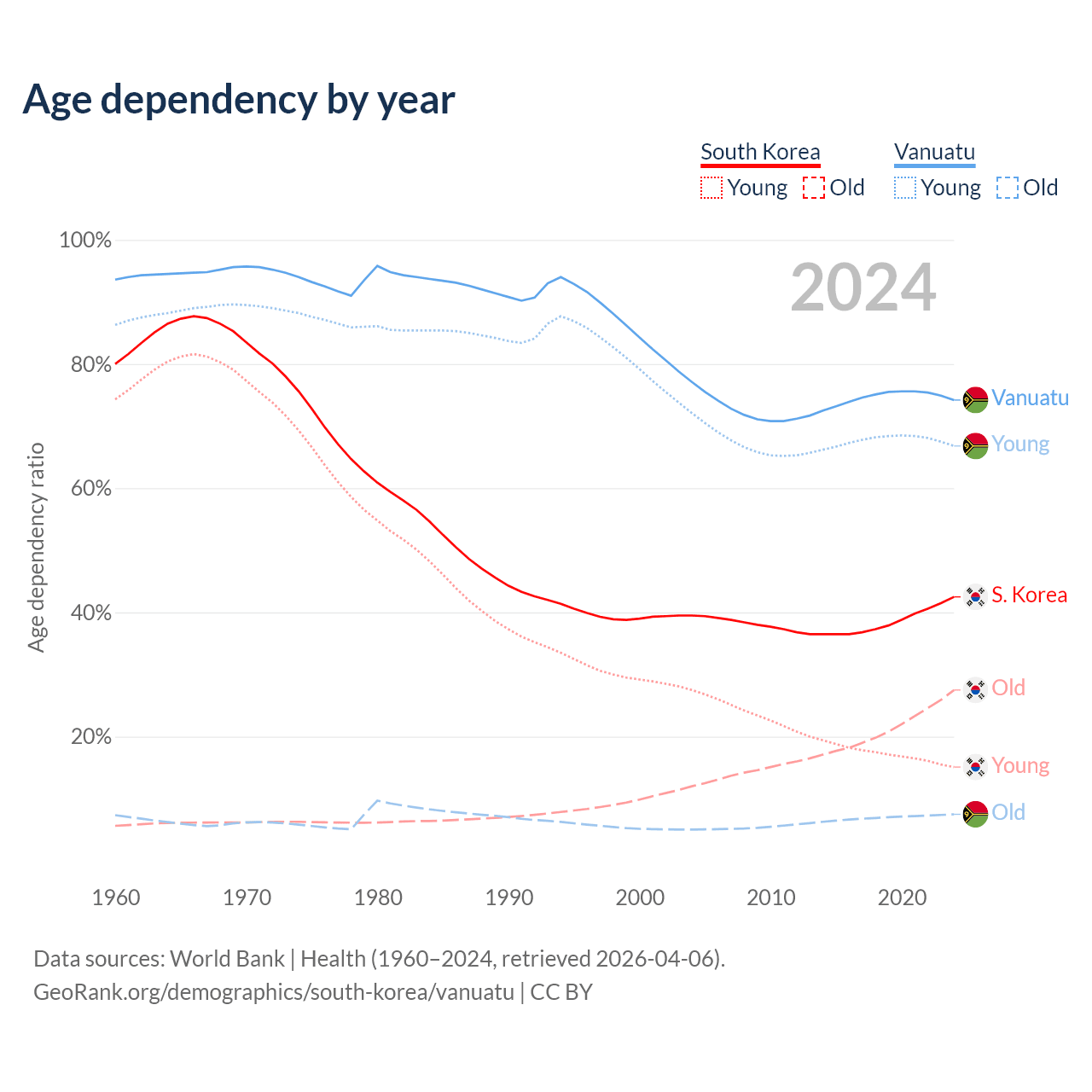 - South Korea is ranked 10/196 by median age (oldest to youngest) vs 156/196 for Vanuatu.