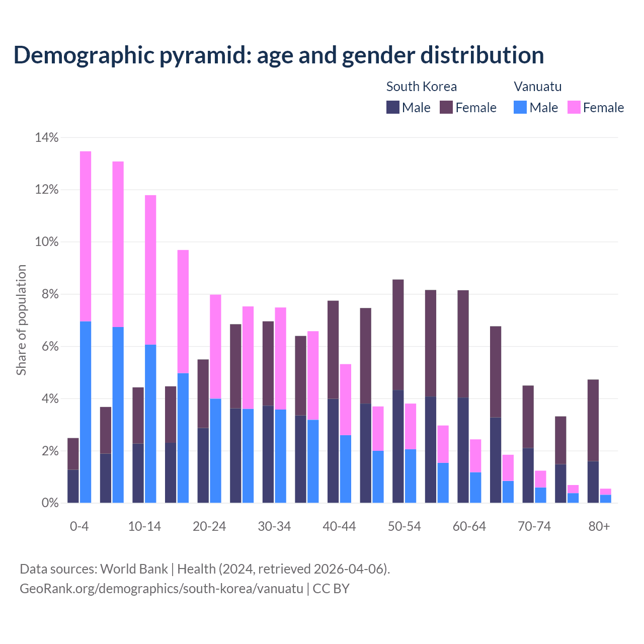 - As of 2026, the population of South Korea is 51.6M vs 345K in Vanuatu - 149.8 times difference.