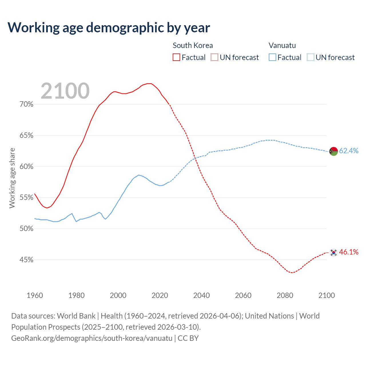 - South Korea has 36.2M working age adults (aged 15-64) vs 198K in Vanuatu.