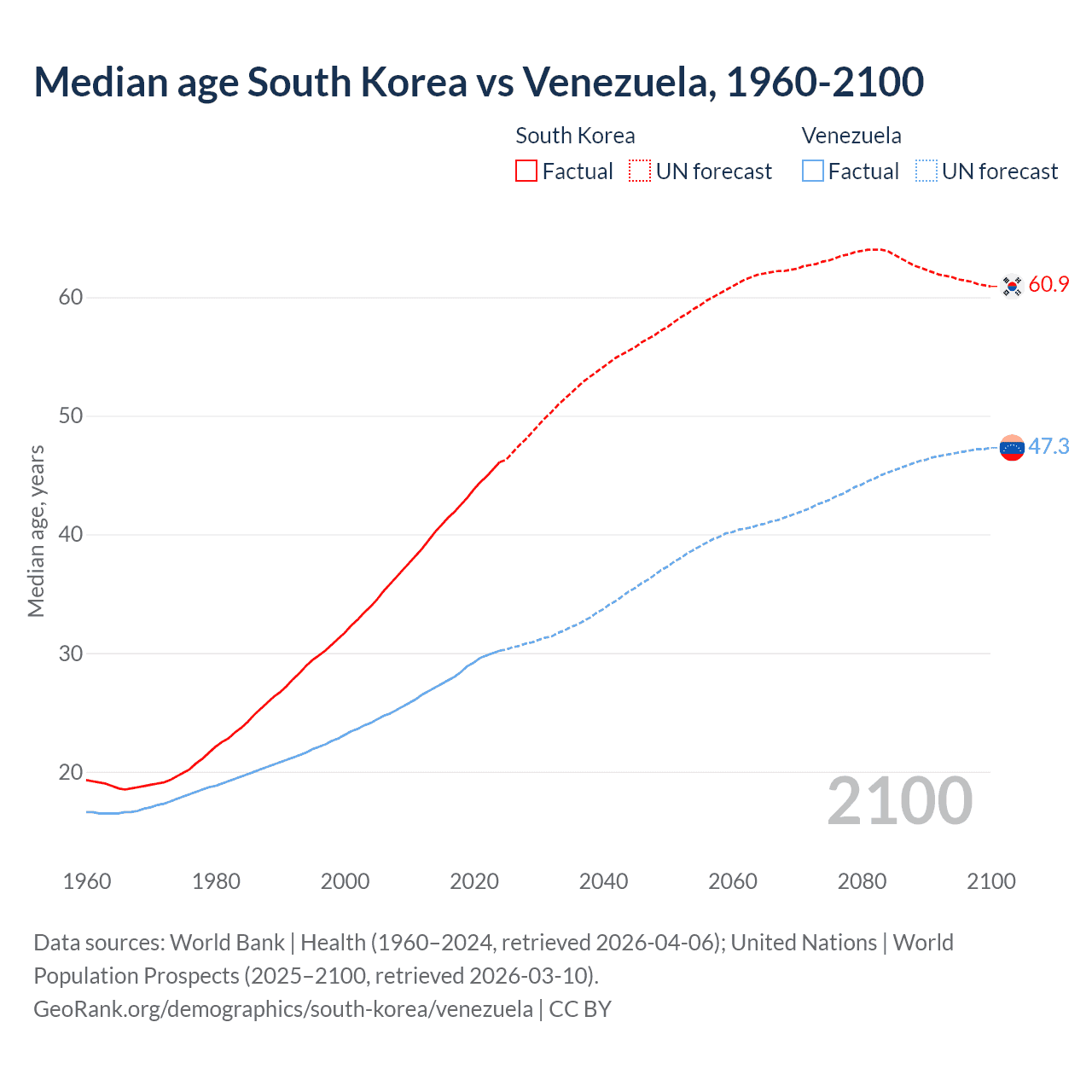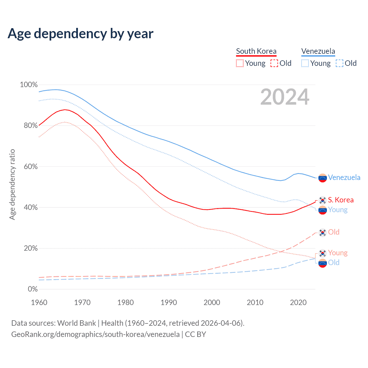 - South Korea is ranked 10/196 by median age (oldest to youngest) vs 104/196 for Venezuela.