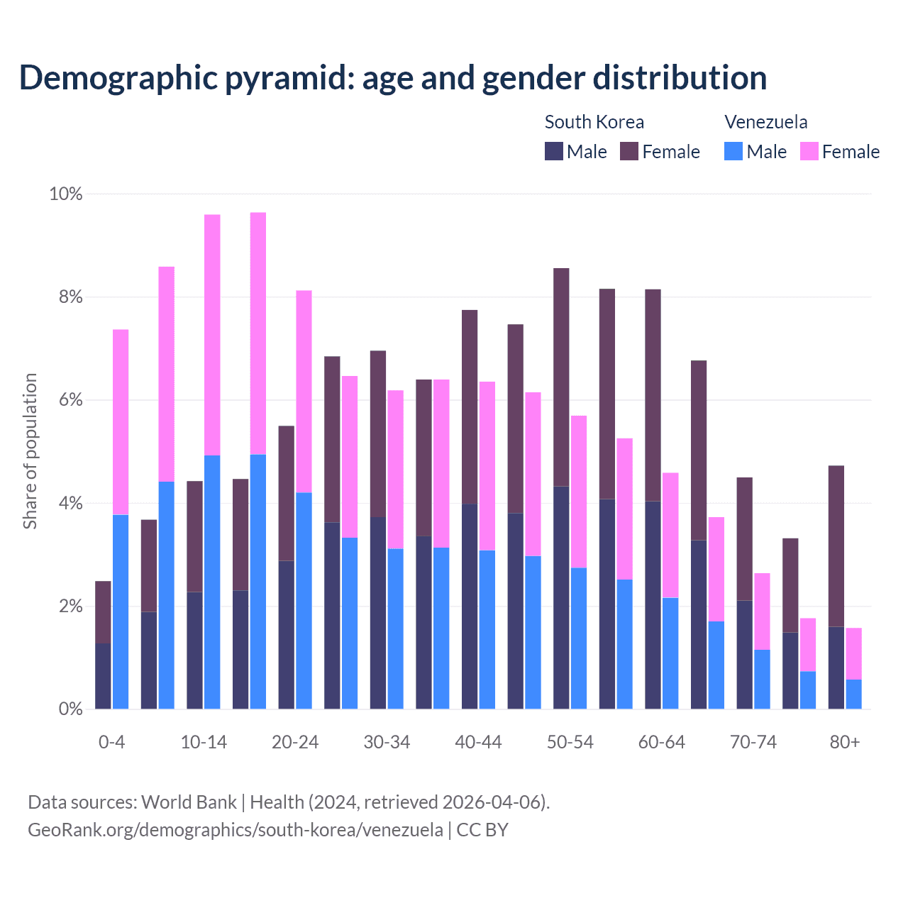 - As of 2026, the population of South Korea is 51.6M vs 28.7M in Venezuela - 1.8 times difference.
