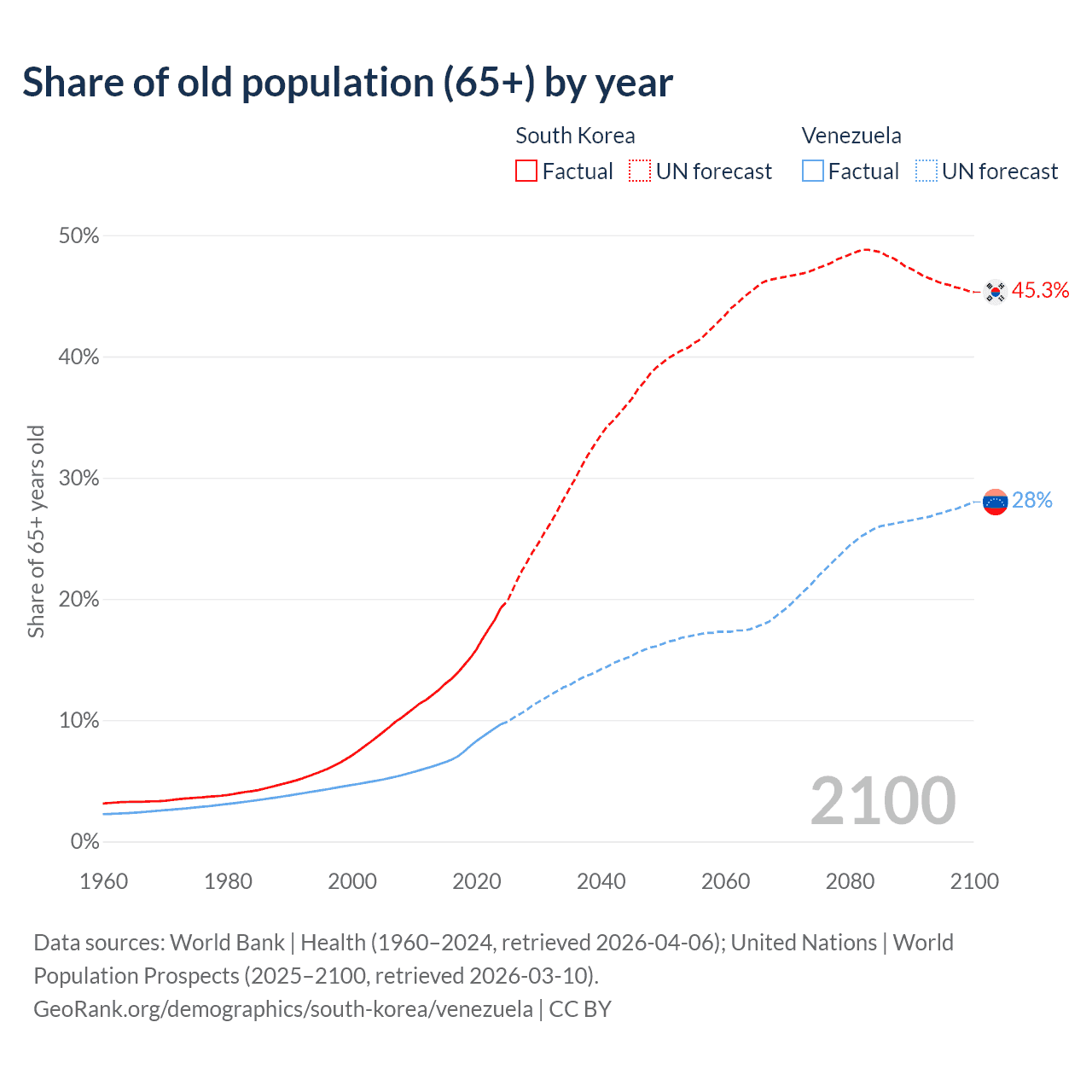 The share of older people aged 65 and over is 19.3% in South Korea and 9.68% in Venezuela. Life expectancy in South Korea compared to Venezuela .