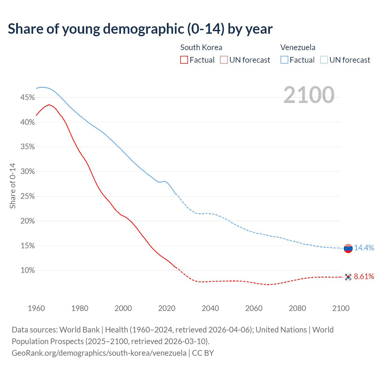 - The share of young demographic (0-15 years old) in South Korea is 10.6% vs 25.5% in Venezuela.