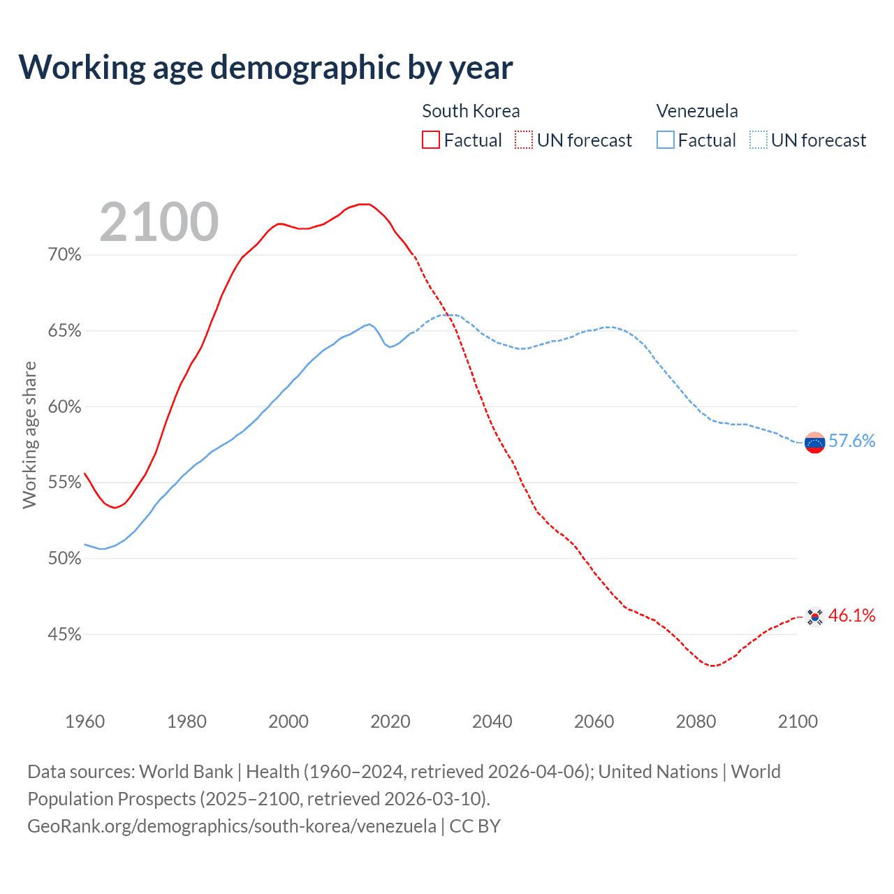 - South Korea has 36.2M working age adults (aged 15-64) vs 18.6M in Venezuela.