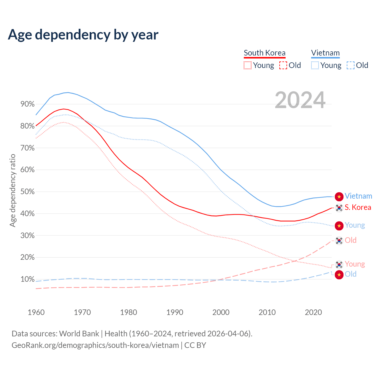 Data sources: World Bank | Health (1960–2024, retrieved 2026-04-06); U.S. Census Bureau (1960–2024, retrieved 2026-02-08).