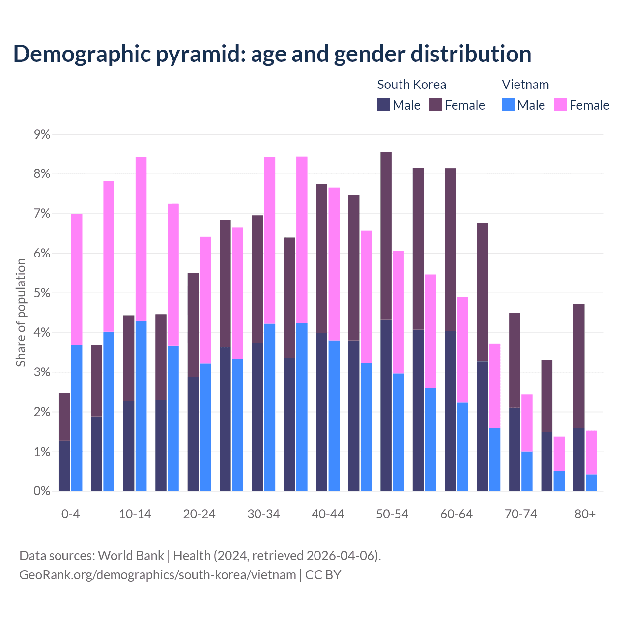 The share of older people aged 65 and over is 19.3% in South Korea and 9.05% in Vietnam. Life expectancy in South Korea compared to Vietnam .