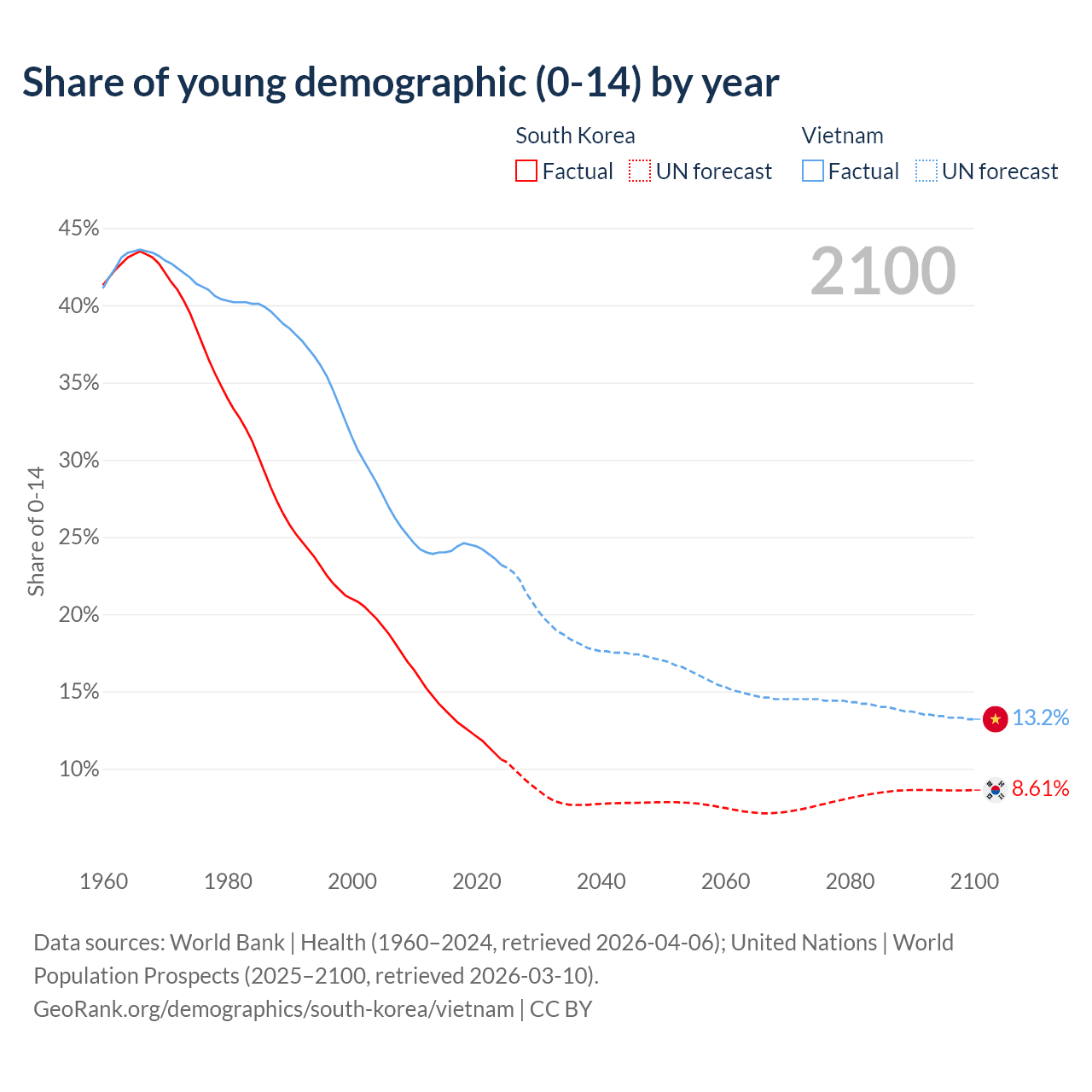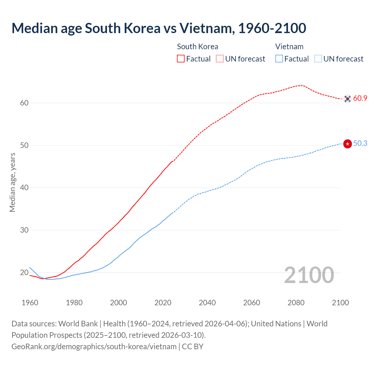Median age South Korea vs Vietnam, 1960-2100