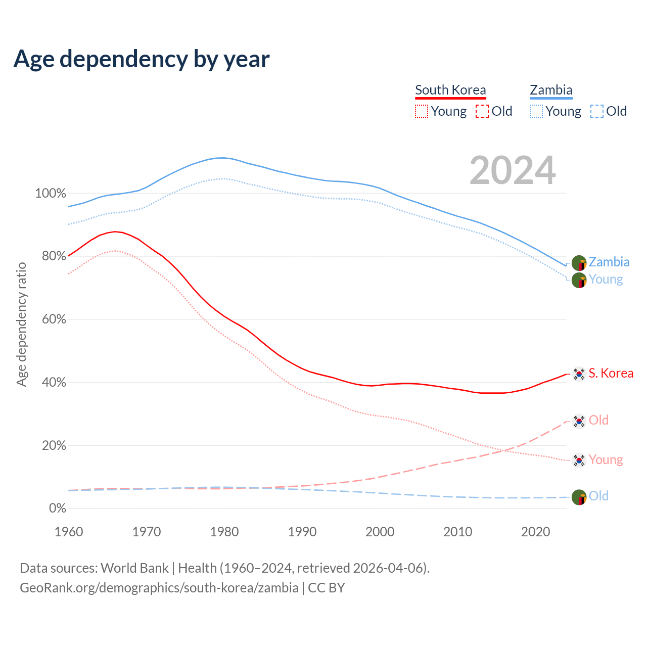 The share of older people aged 65 and over is 19.3% in South Korea and 1.95% in Zambia. Life expectancy in South Korea compared to Zambia .