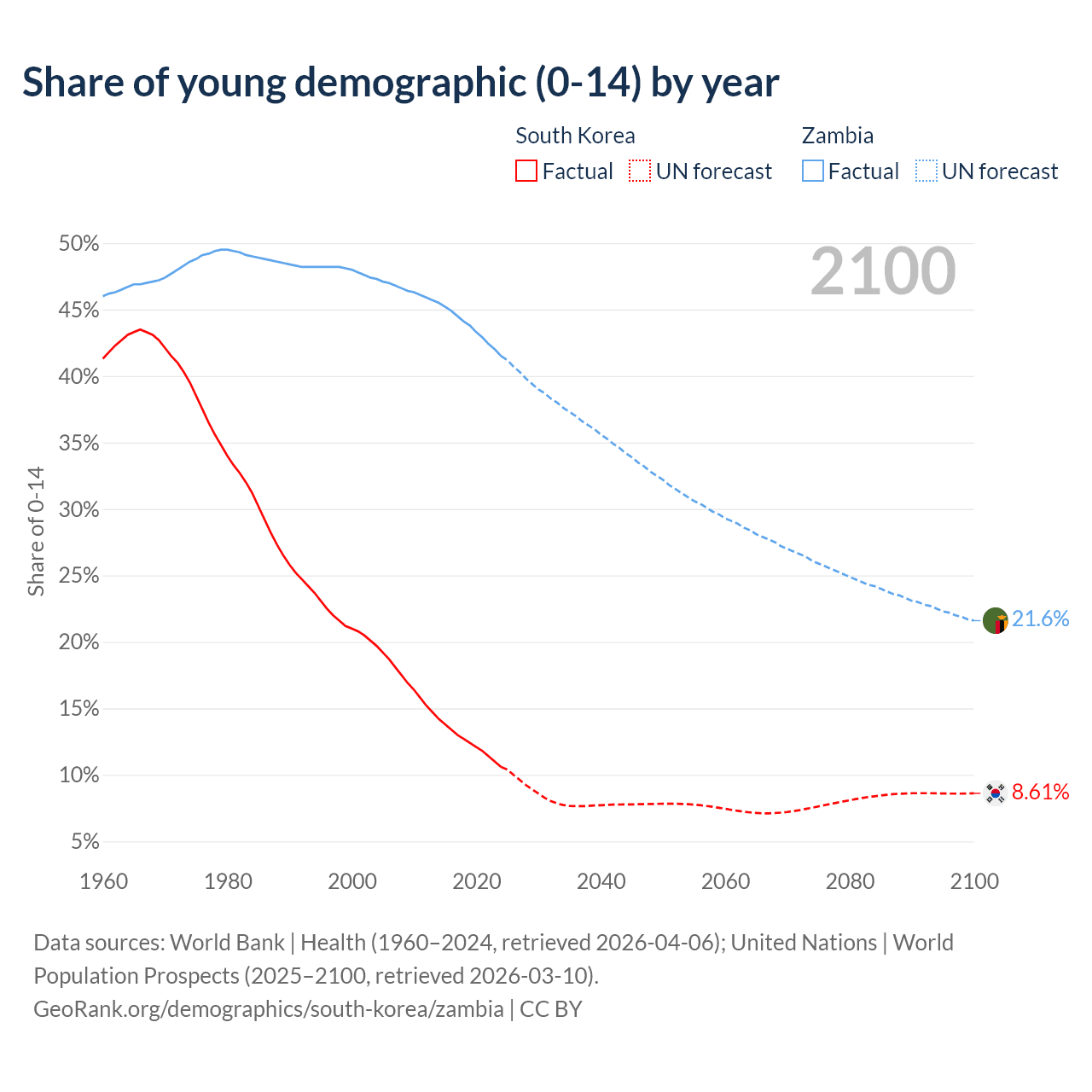 - The share of young demographic (0-15 years old) in South Korea is 10.6% vs 41.5% in Zambia.
