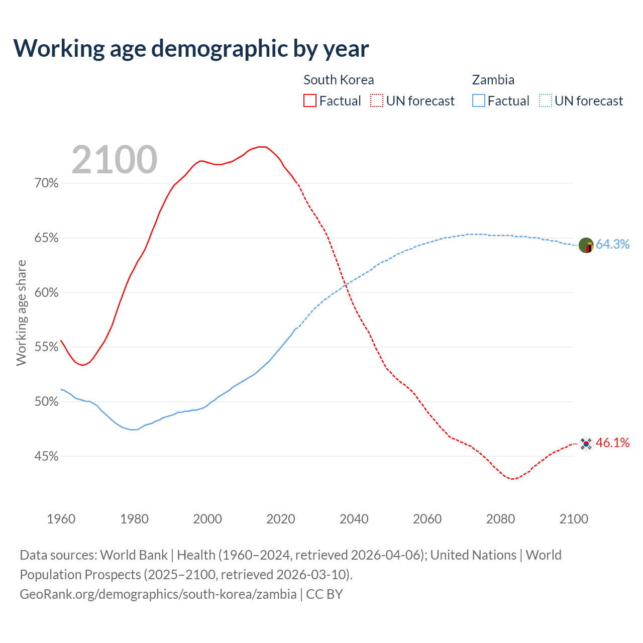 - South Korea has 36.2M working age adults (aged 15-64) vs 12.8M in Zambia.