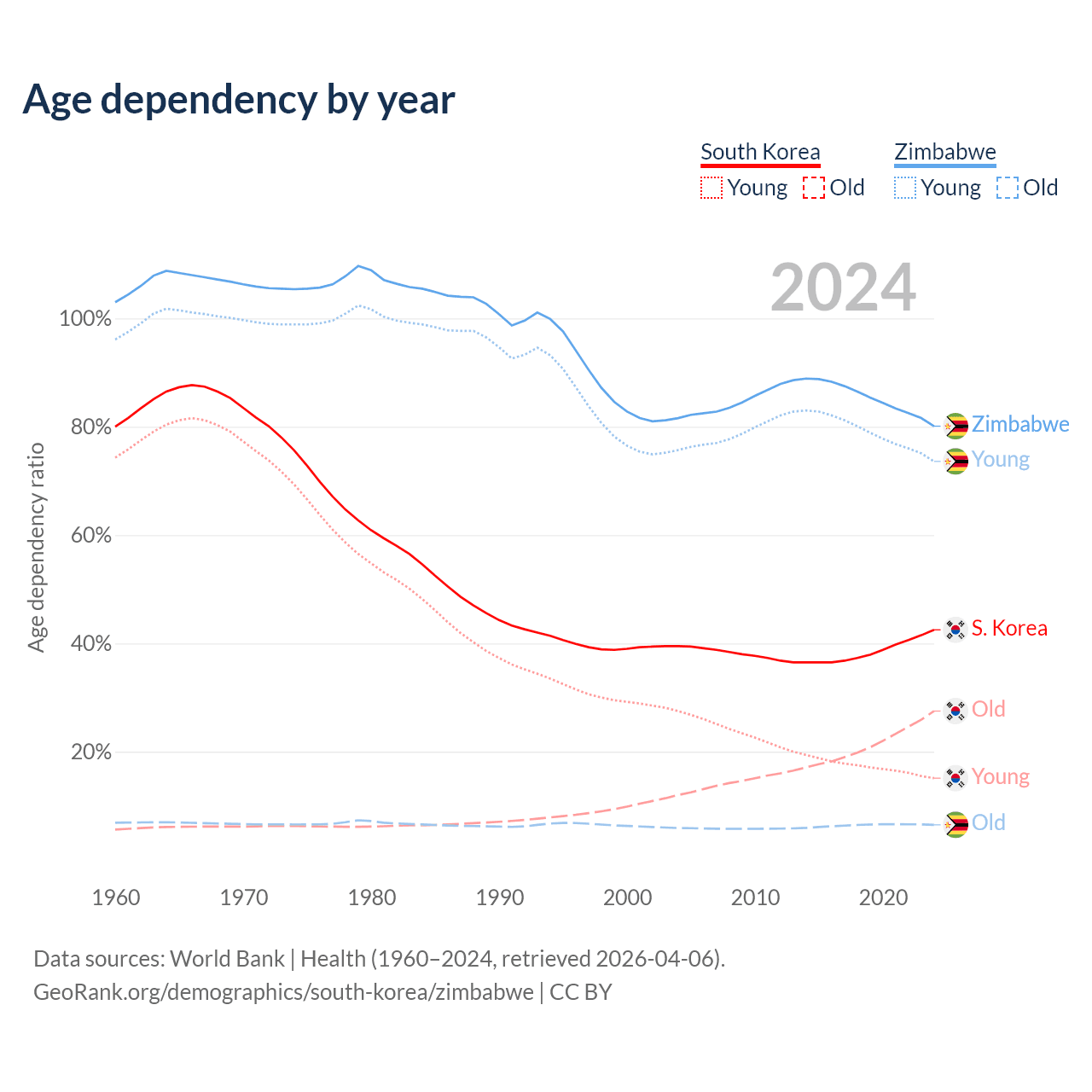 The share of older people aged 65 and over is 19.3% in South Korea and 3.6% in Zimbabwe. Life expectancy in South Korea compared to Zimbabwe .