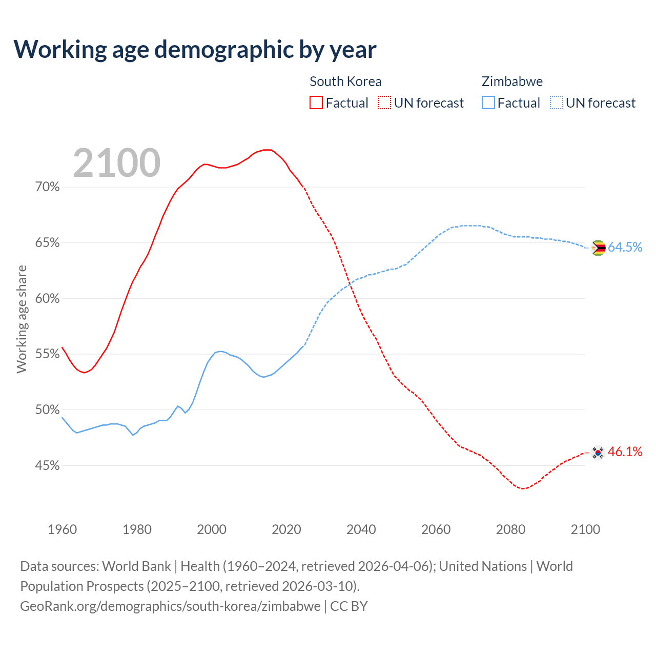 - South Korea has 36.2M working age adults (aged 15-64) vs 9.64M in Zimbabwe.