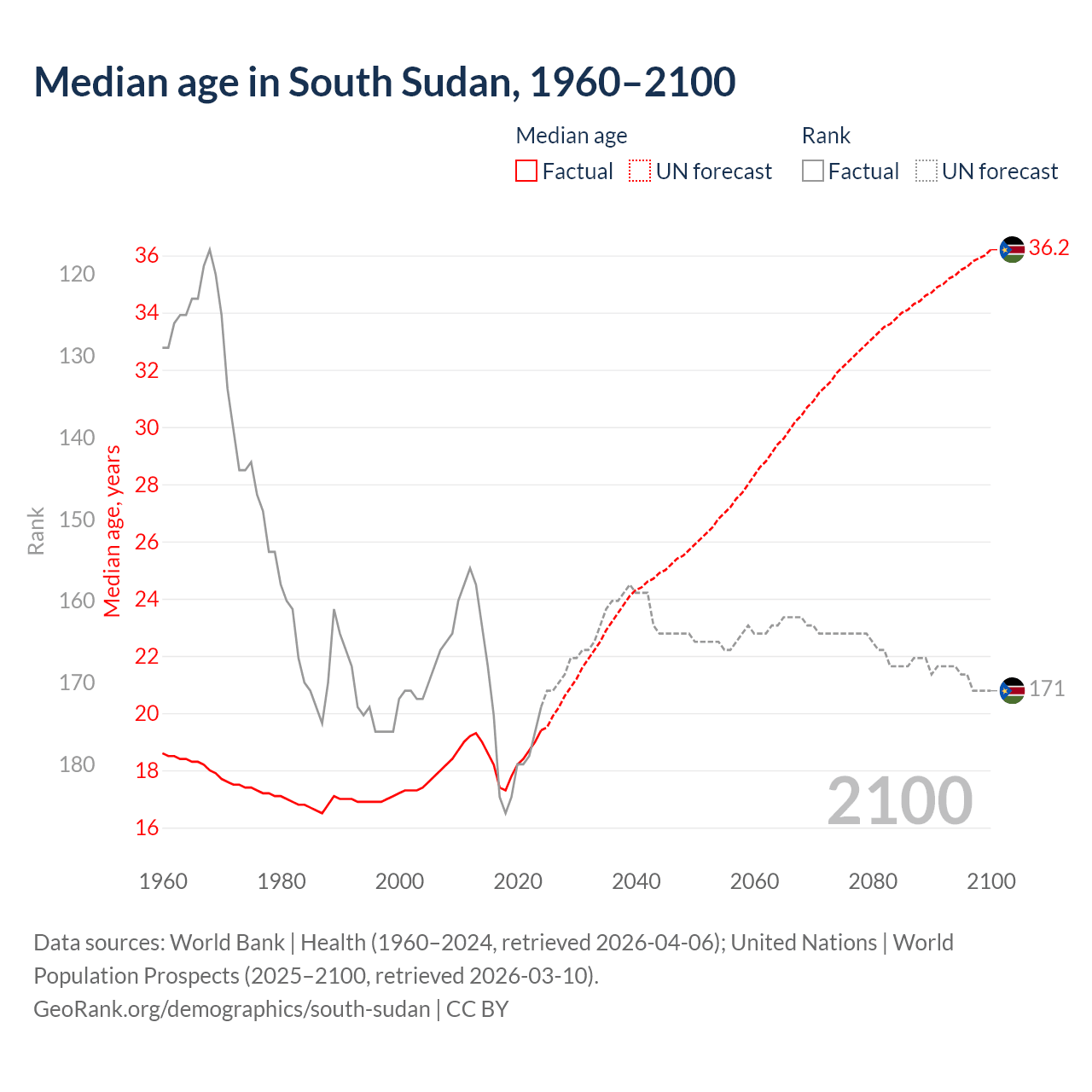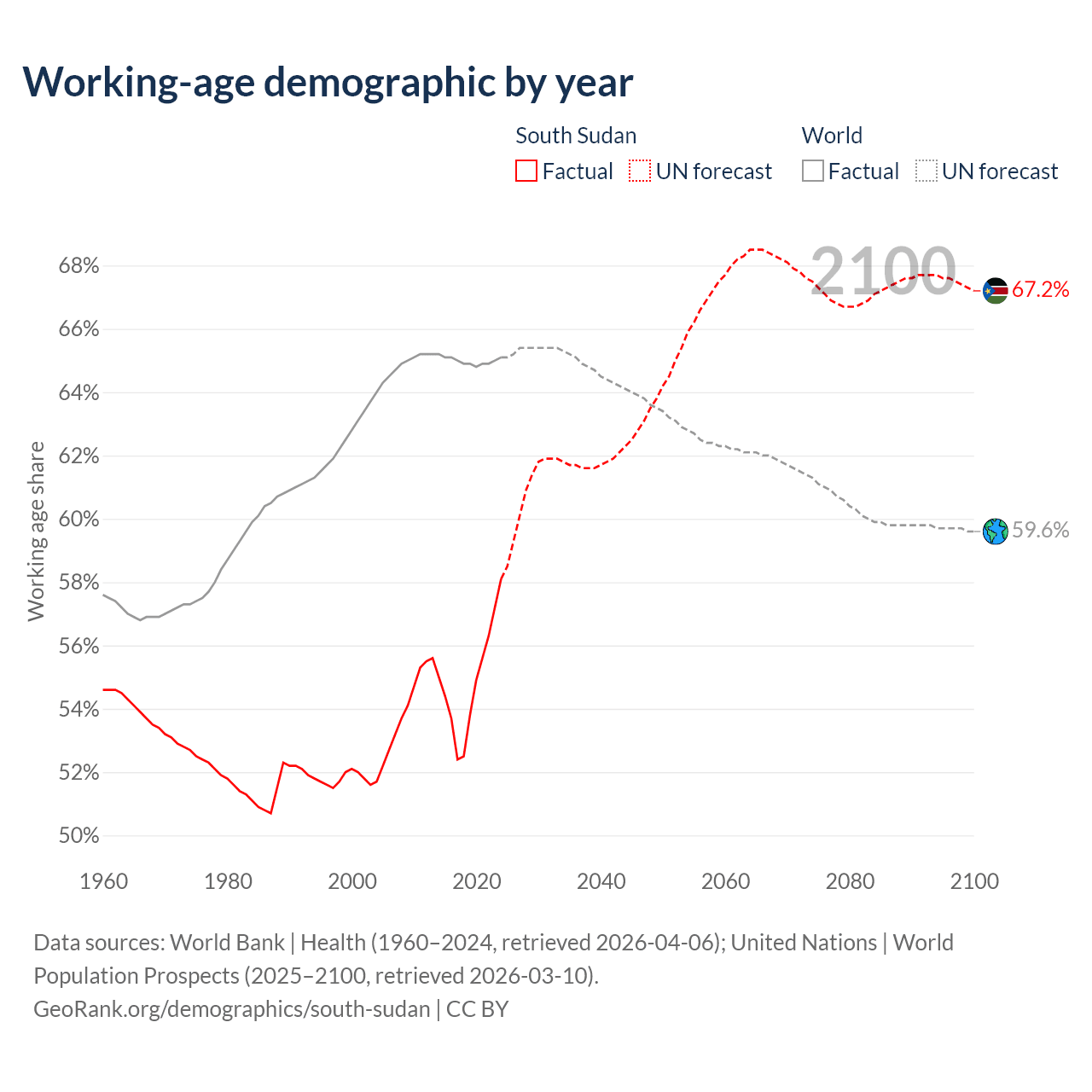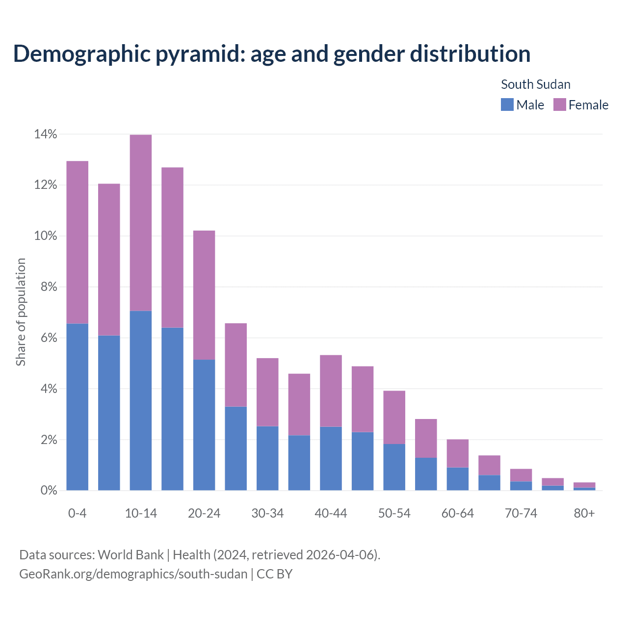 With a population of 11.9M people, South Sudan has a median age of 19.4 years which makes it the 173/196 oldest country. 38.9% of the demographic are children 0-14 years old, 58.1% are working-age people aged 15-64, and 2.99% are older population aged 65+ years.