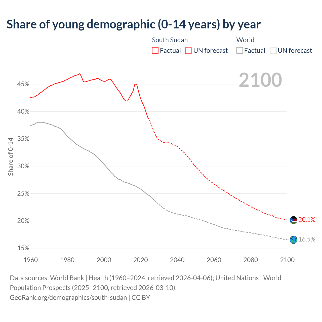 The share of children aged 0-14 in South Sudan decreased from 45.8% to 38.9% between 2004 and 2024 due to changes in birth rates.