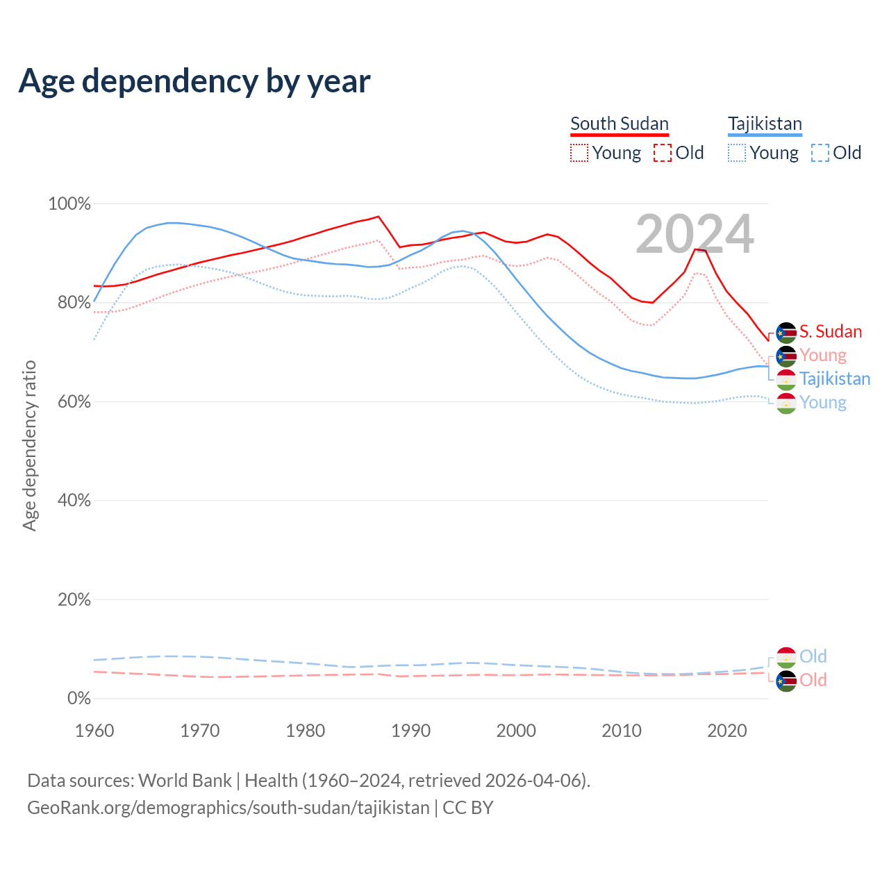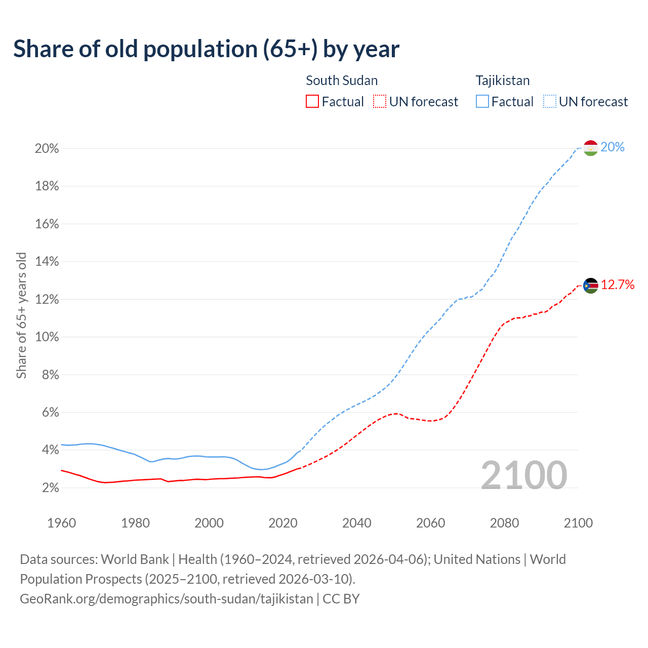 The share of older people aged 65 and over is 2.99% in South Sudan and 3.85% in Tajikistan. Life expectancy in South Sudan compared to Tajikistan .