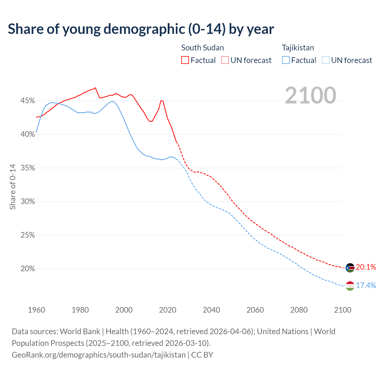 - The share of young demographic (0-15 years old) in South Sudan is 38.9% vs 36.3% in Tajikistan.