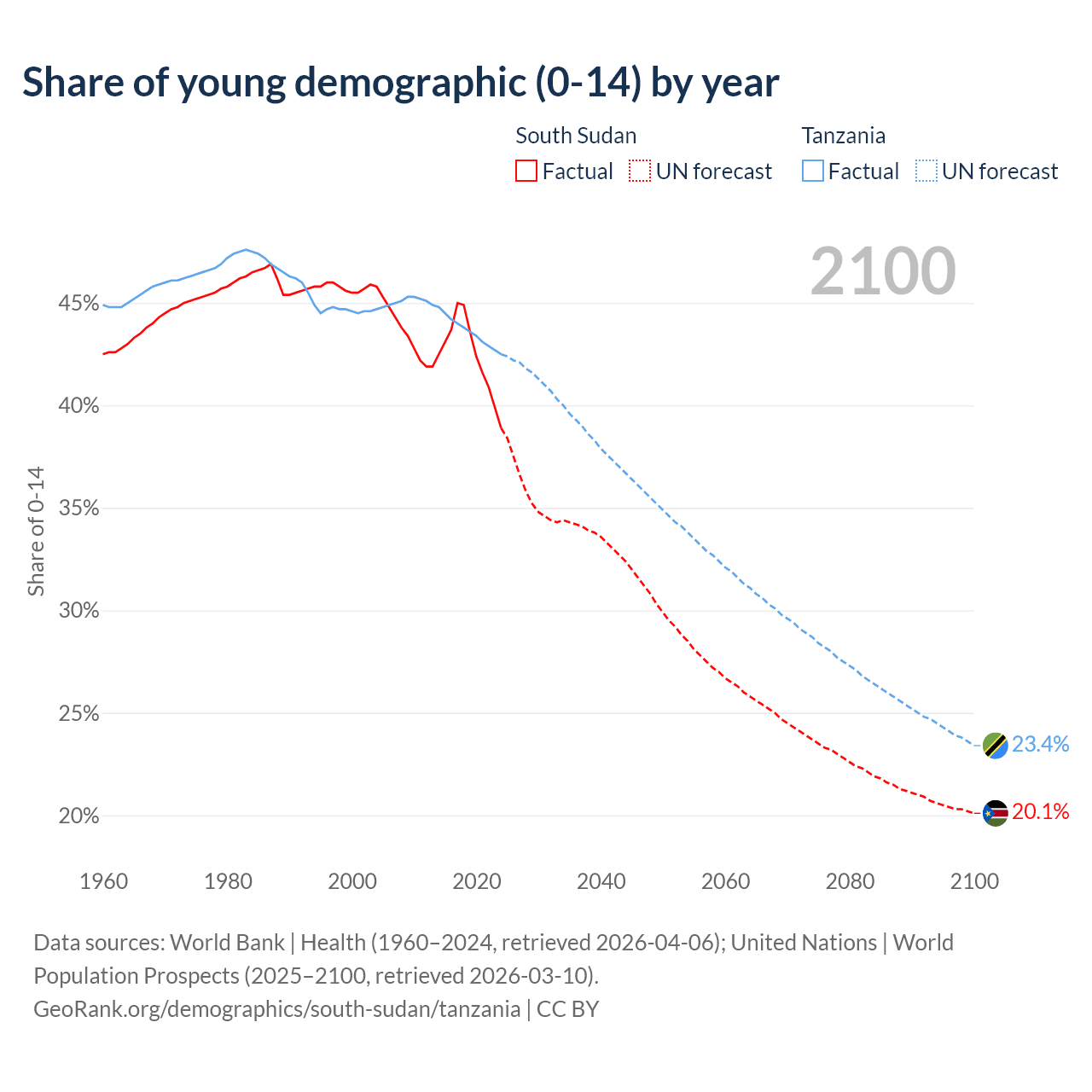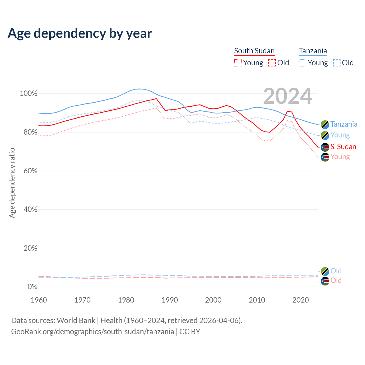- The share of old-age demographic (65+) in South Sudan is 2.99% vs 3.05% in Tanzania.