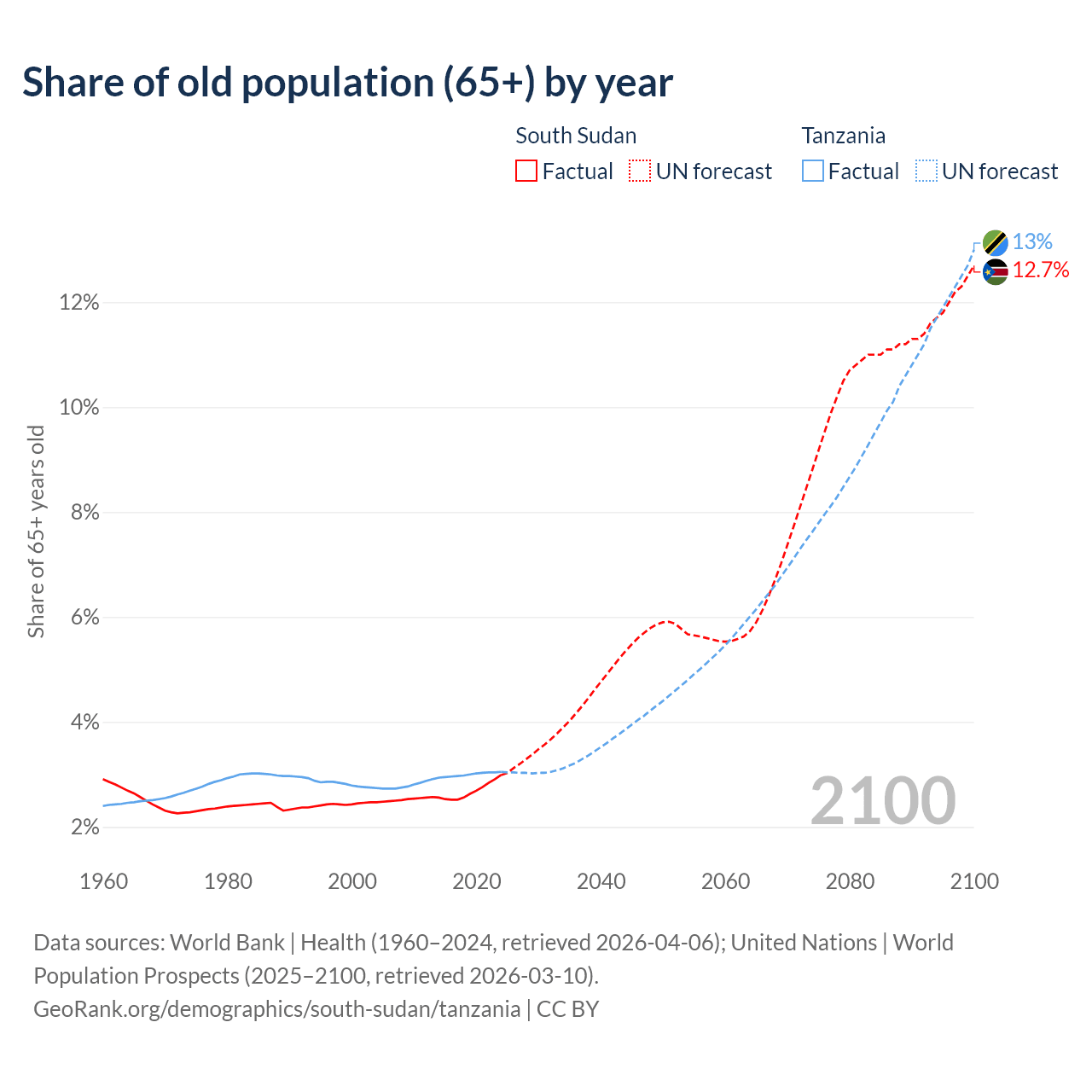 The share of older people aged 65 and over is 2.99% in South Sudan and 3.05% in Tanzania. Life expectancy in South Sudan compared to Tanzania .