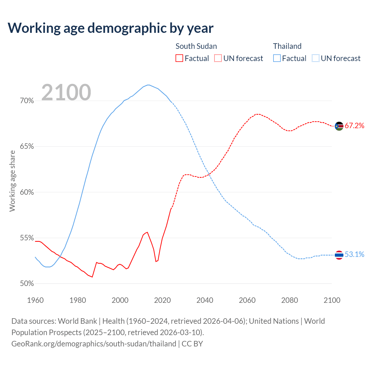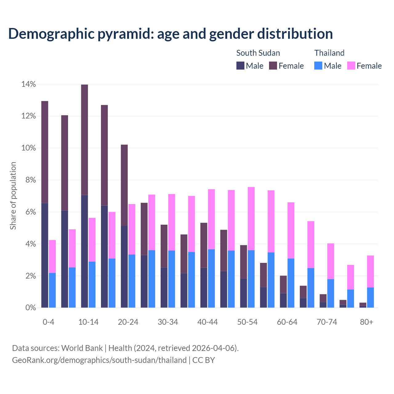 - South Sudan is ranked 173/196 by median age (oldest to youngest) vs 40/196 for Thailand.