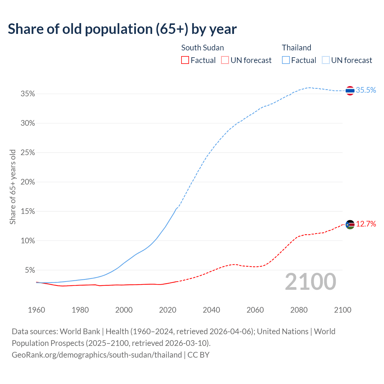 The share of older people aged 65 and over is 2.99% in South Sudan and 15.4% in Thailand. Life expectancy in South Sudan compared to Thailand .