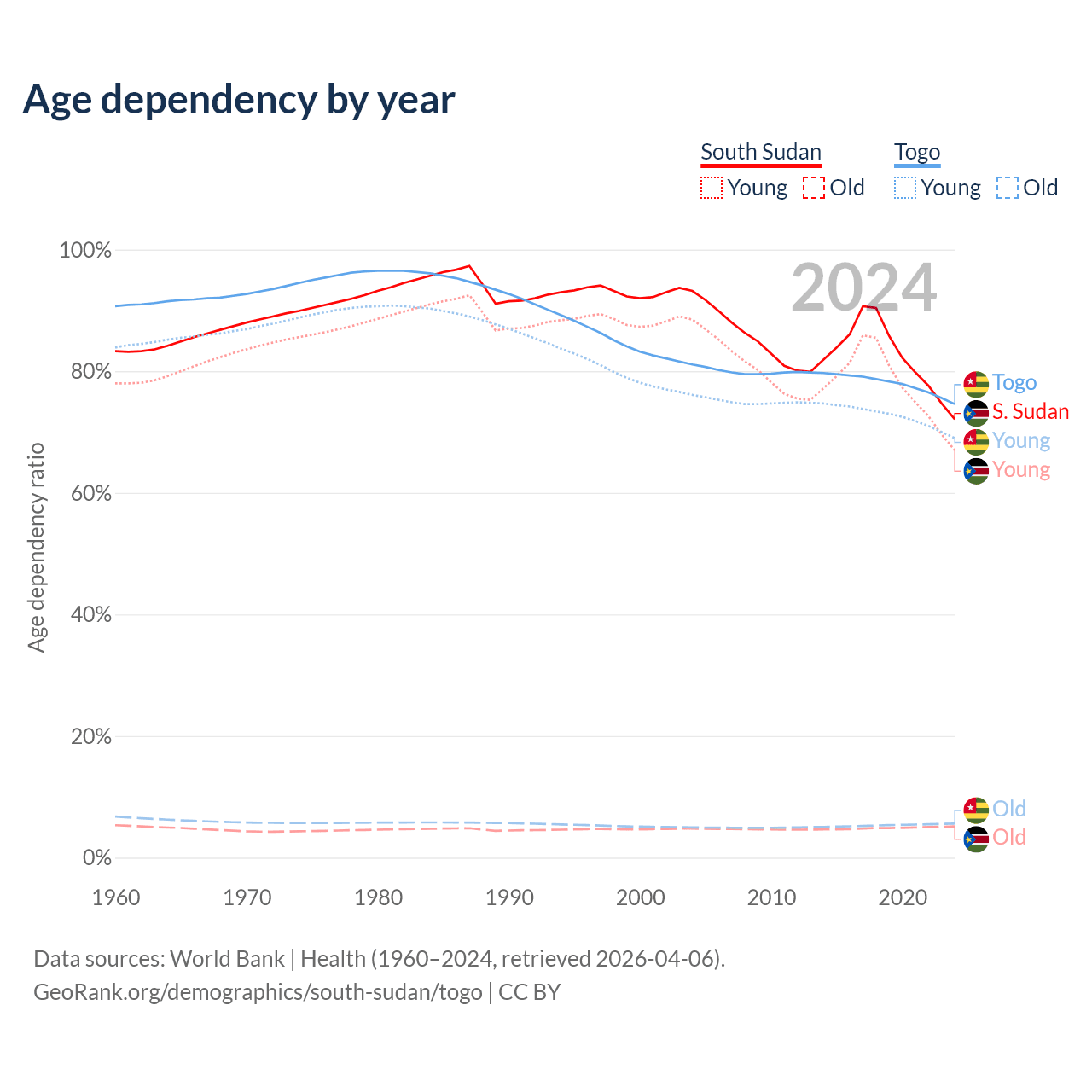 - The share of old-age demographic (65+) in South Sudan is 2.99% vs 3.21% in Togo.