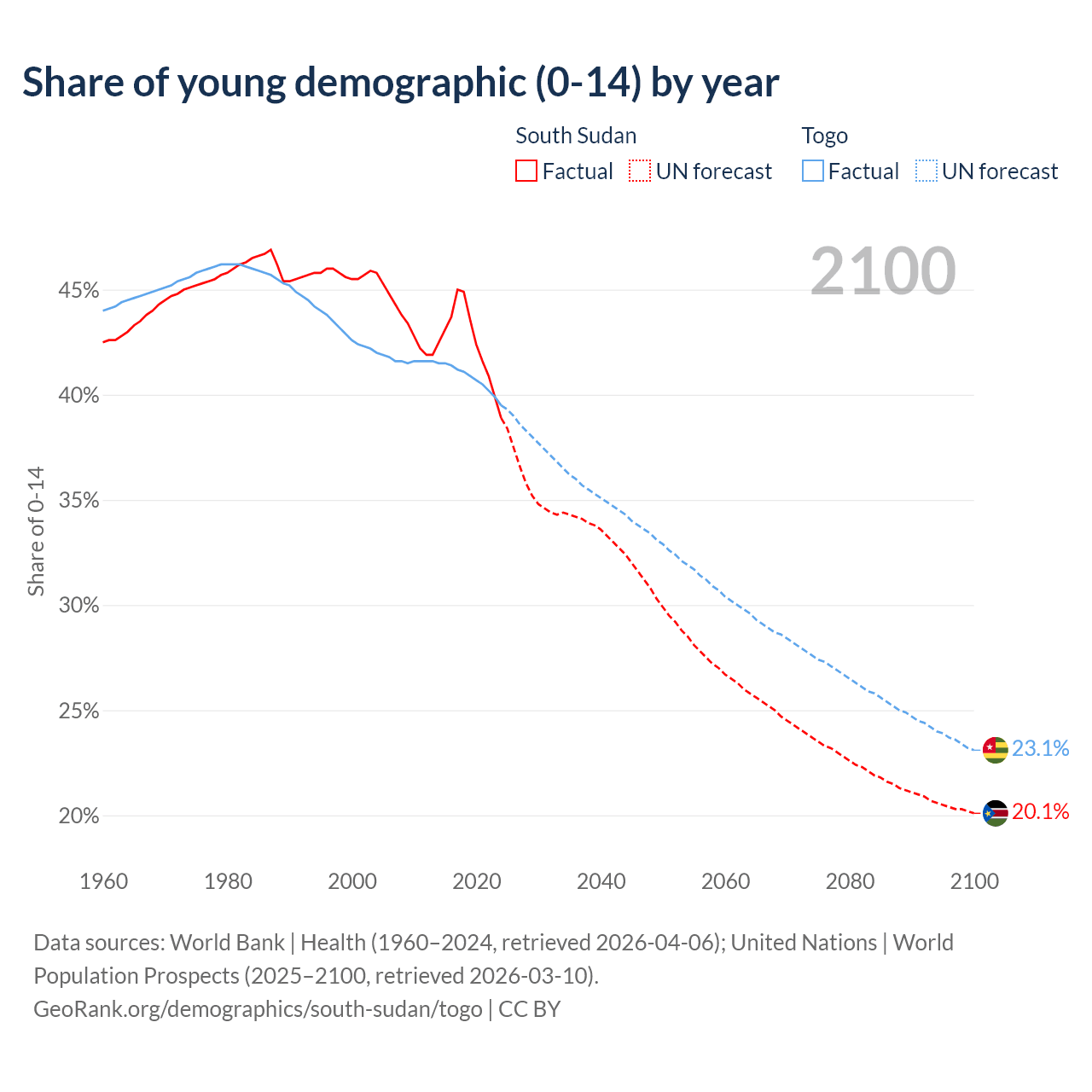 - The share of young demographic (0-15 years old) in South Sudan is 38.9% vs 39.5% in Togo.