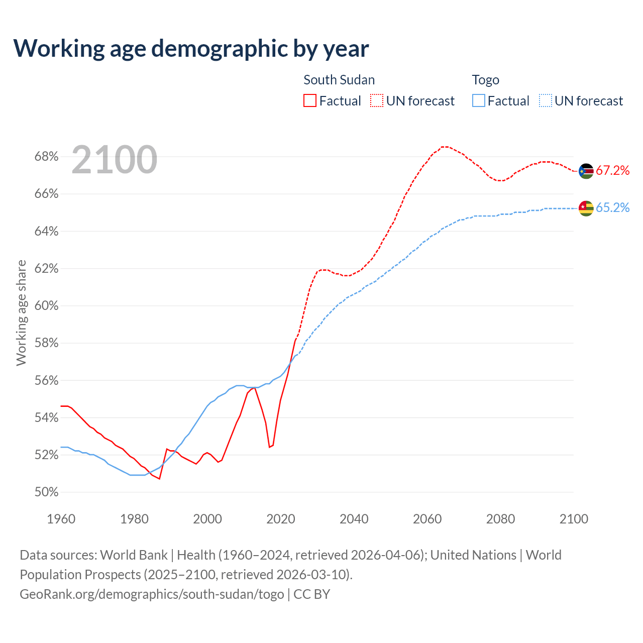 - South Sudan has 7.27M working age adults (aged 15-64) vs 5.72M in Togo.