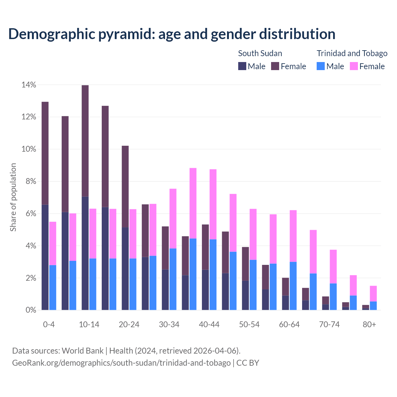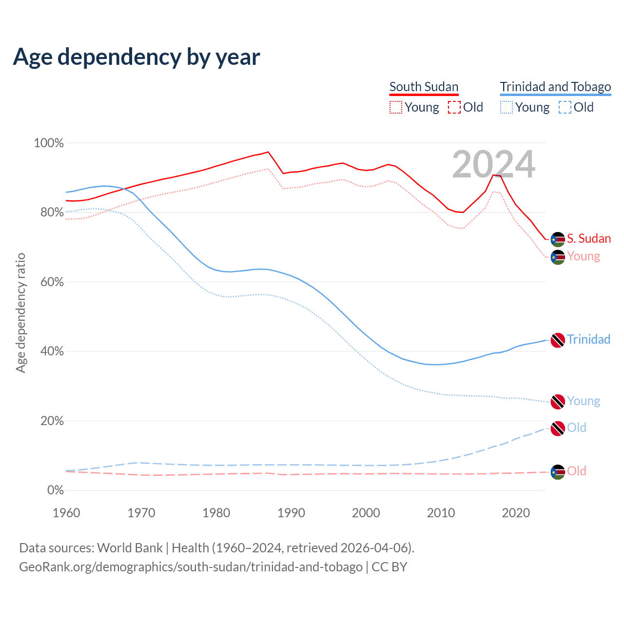- South Sudan is ranked 173/196 by median age (oldest to youngest) vs 58/196 for Trinidad and Tobago.