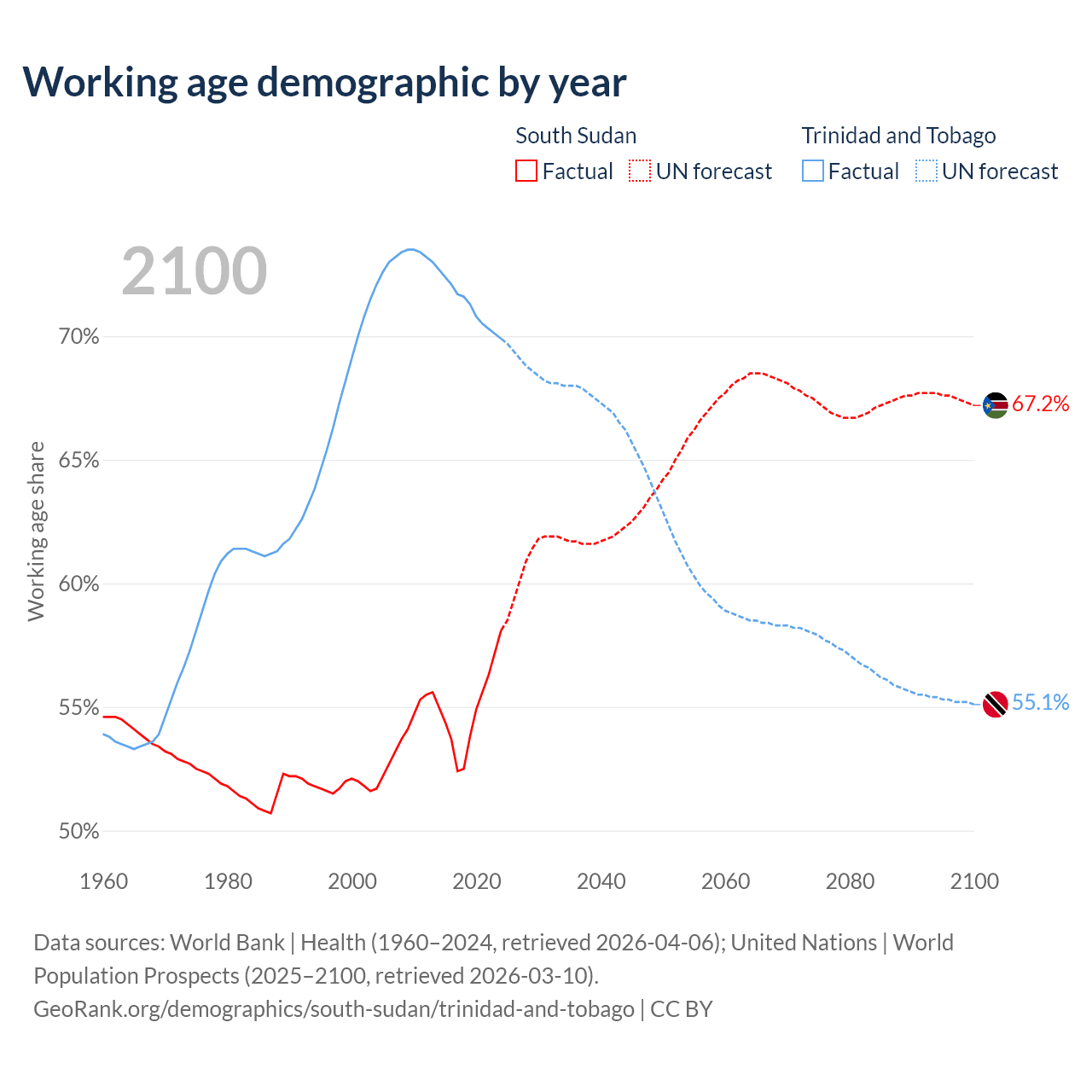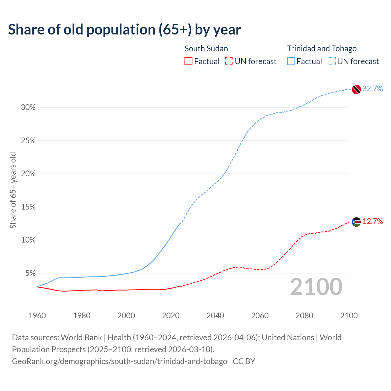The share of older people aged 65 and over is 2.99% in South Sudan and 12.4% in Trinidad and Tobago. Life expectancy in South Sudan compared to Trinidad and Tobago .