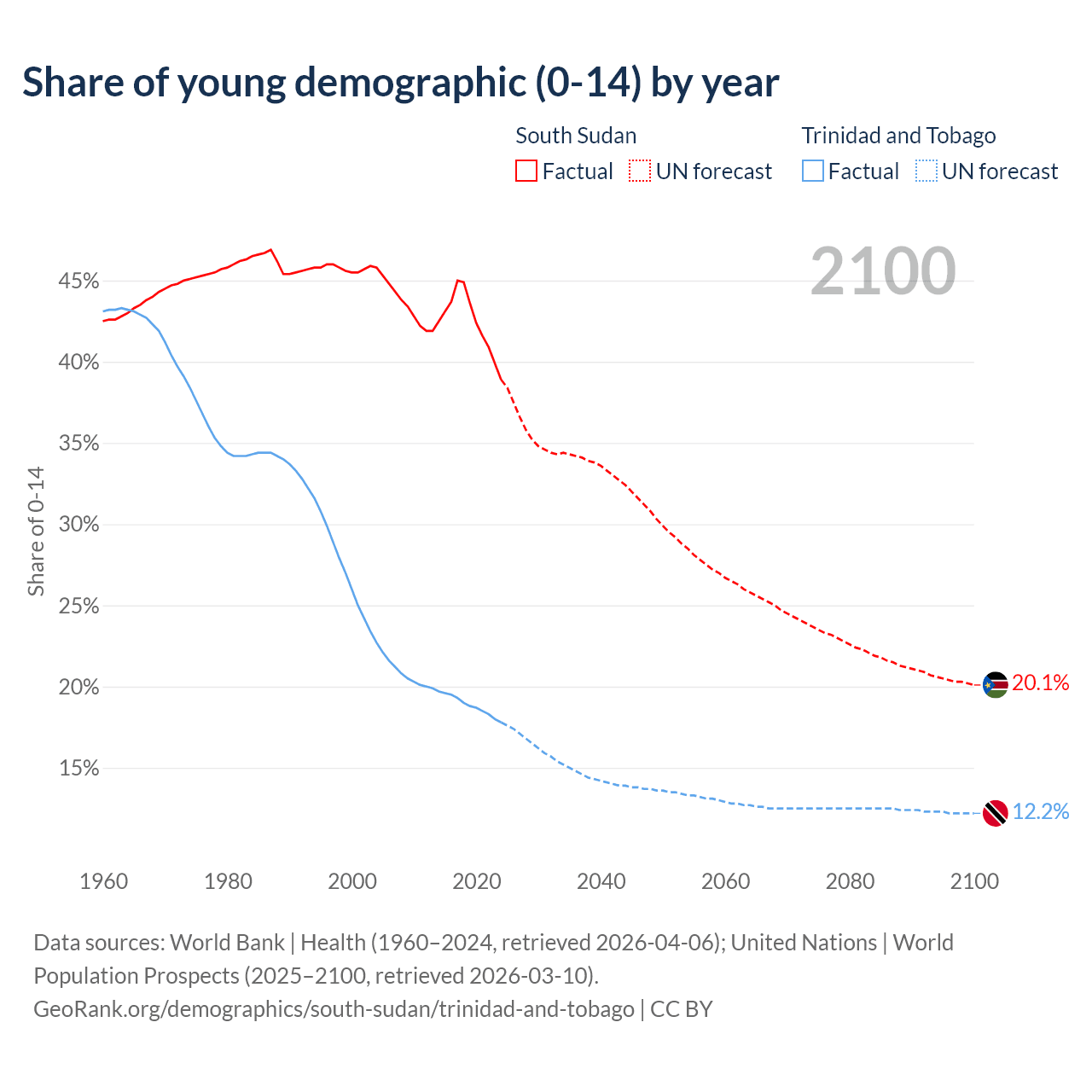 - The share of young demographic (0-15 years old) in South Sudan is 38.9% vs 17.8% in Trinidad and Tobago.