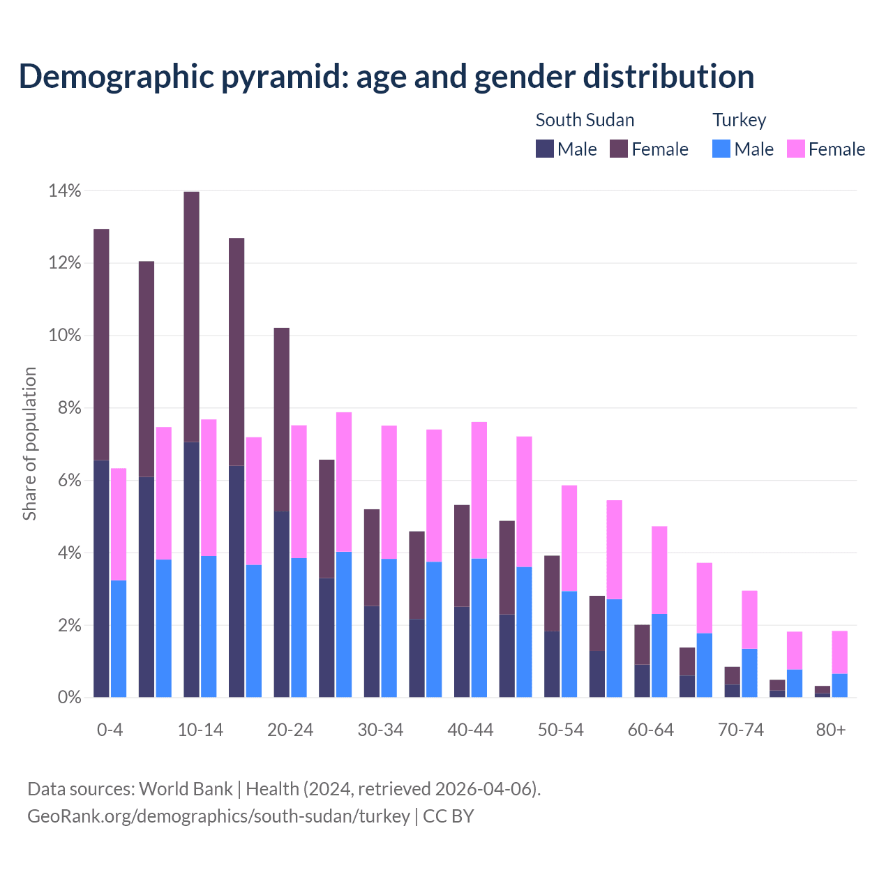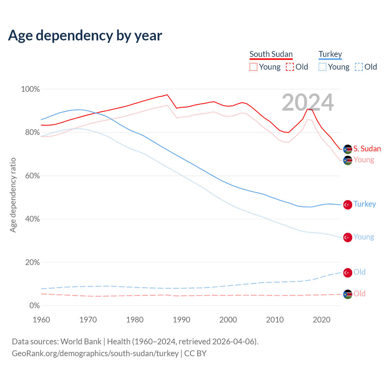- South Sudan is ranked 173/196 by median age (oldest to youngest) vs 83/196 for Turkey.