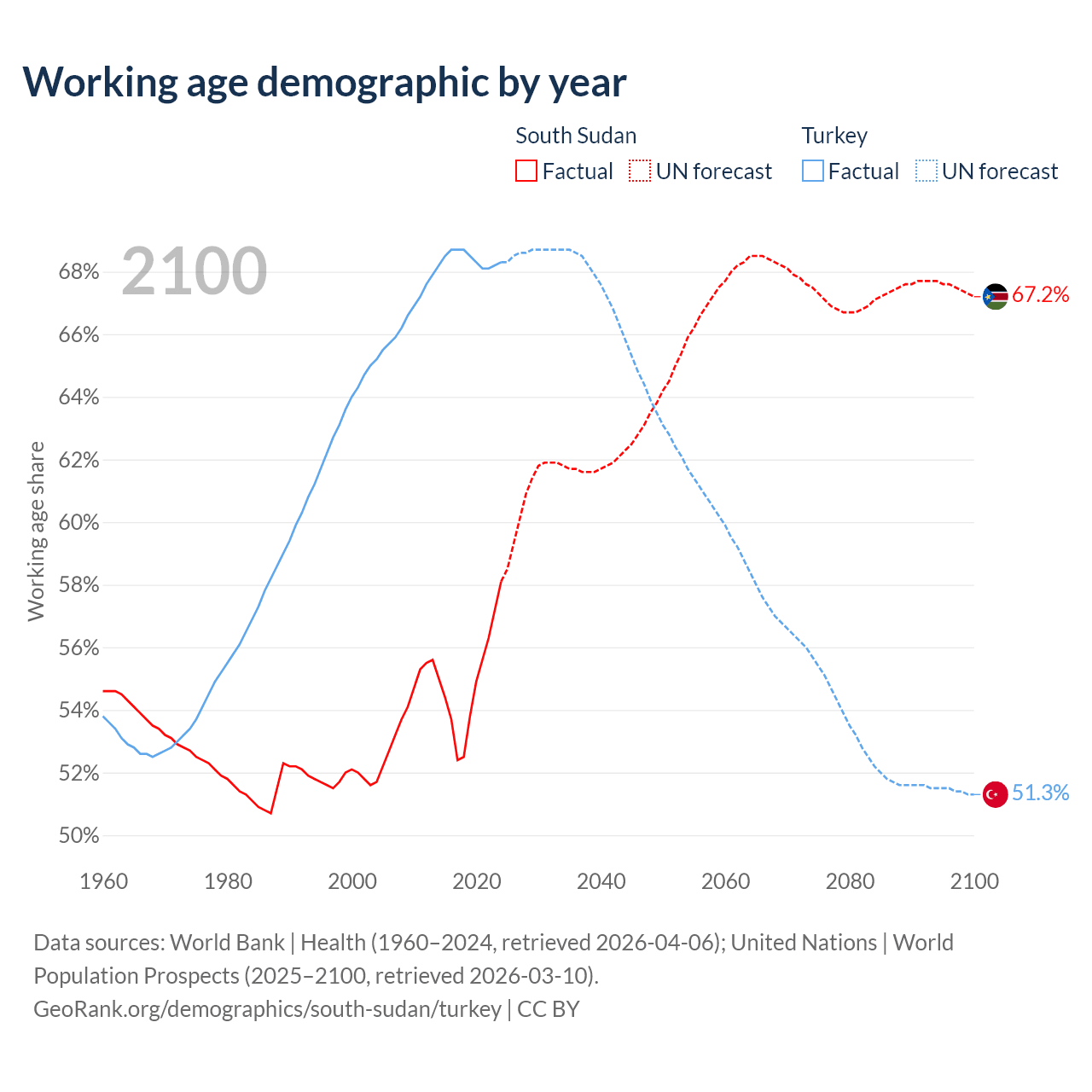 - South Sudan has 7.27M working age adults (aged 15-64) vs 58.7M in Turkey.