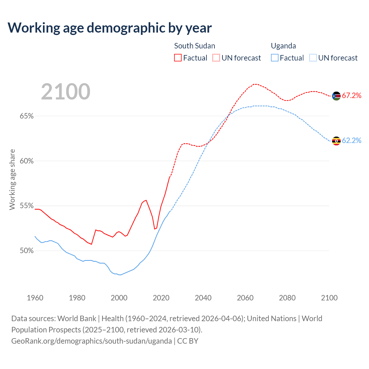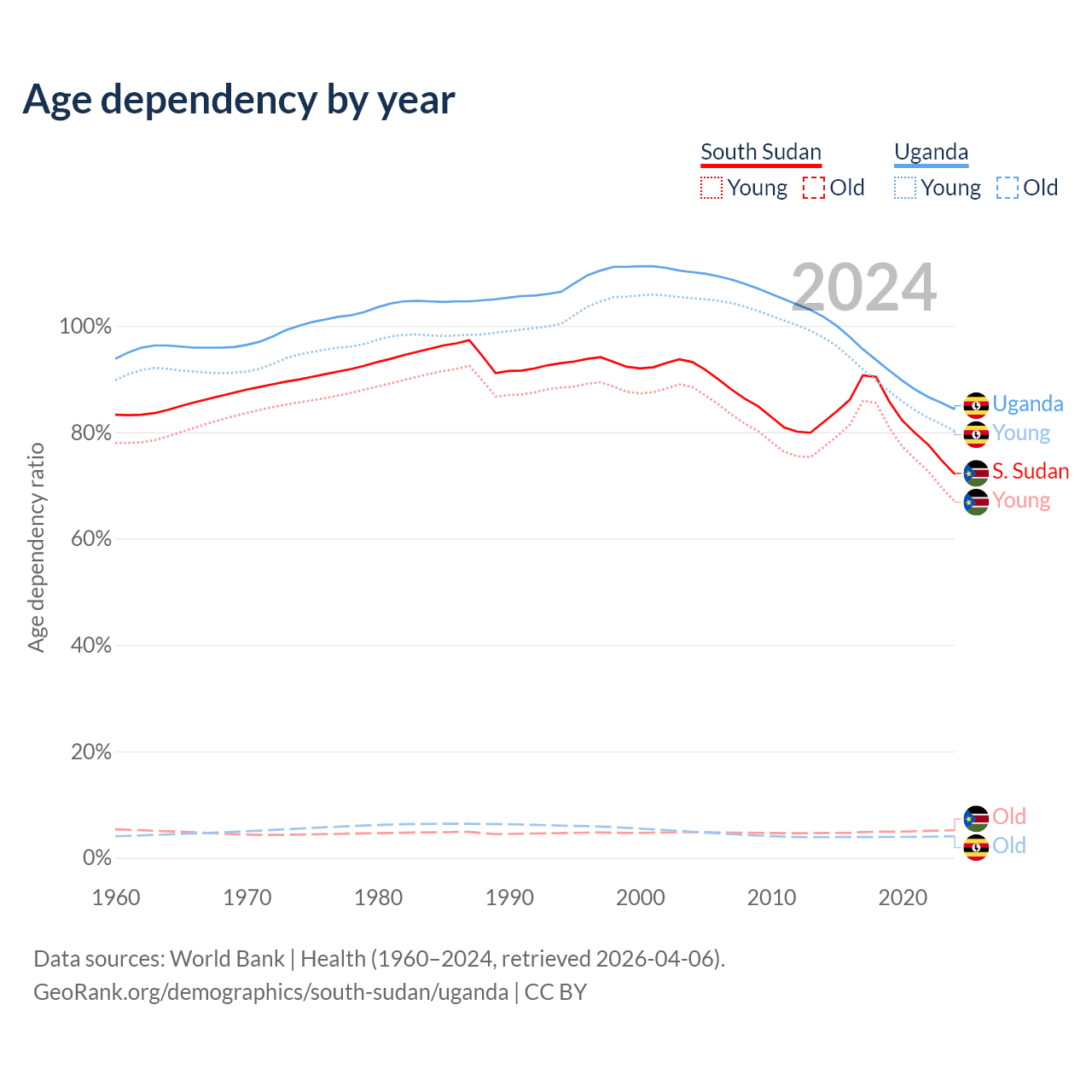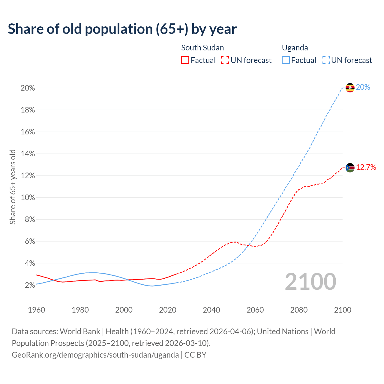 The share of older people aged 65 and over is 2.99% in South Sudan and 2.19% in Uganda. Life expectancy in South Sudan compared to Uganda .
