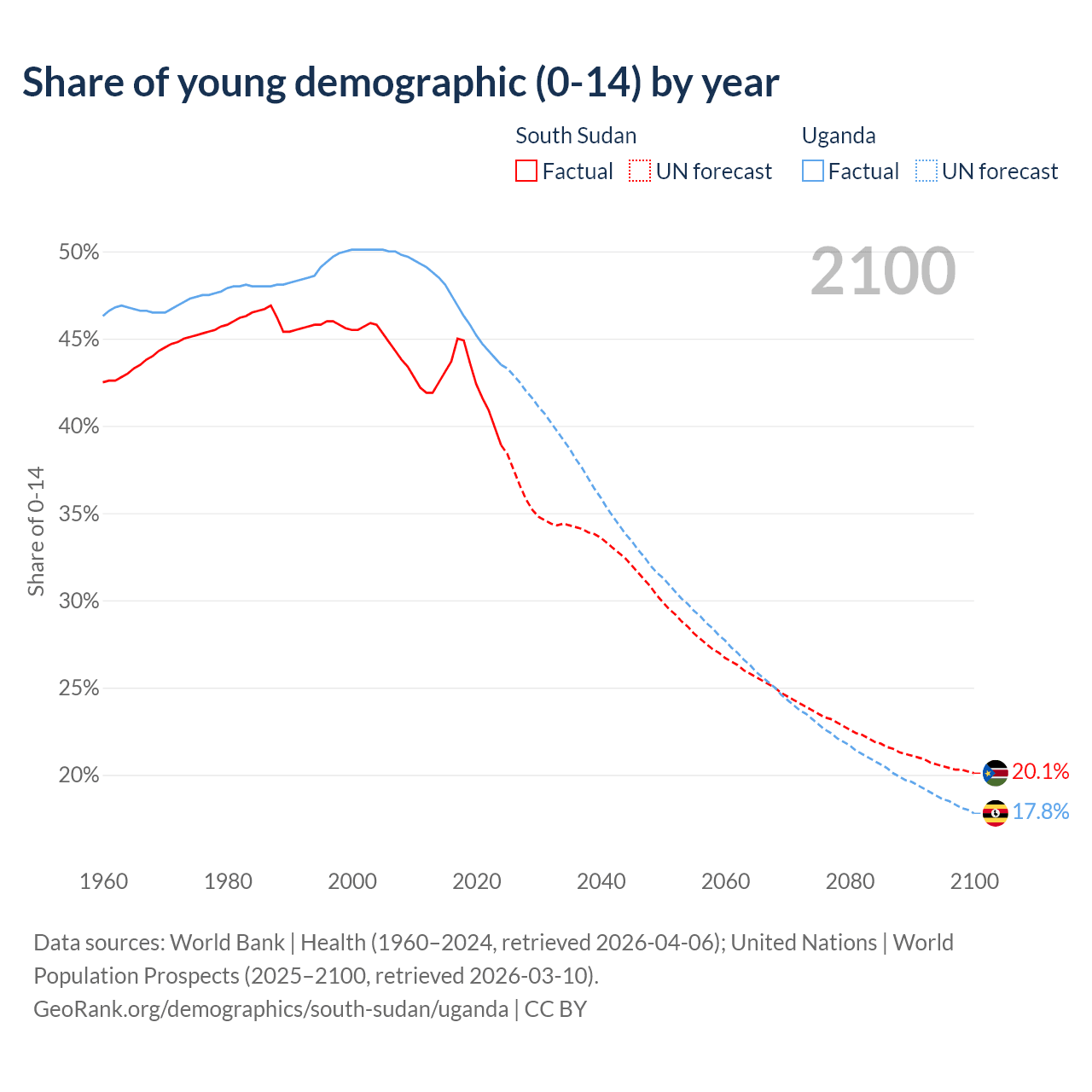 Median age South Sudan vs Uganda, 1960-2100