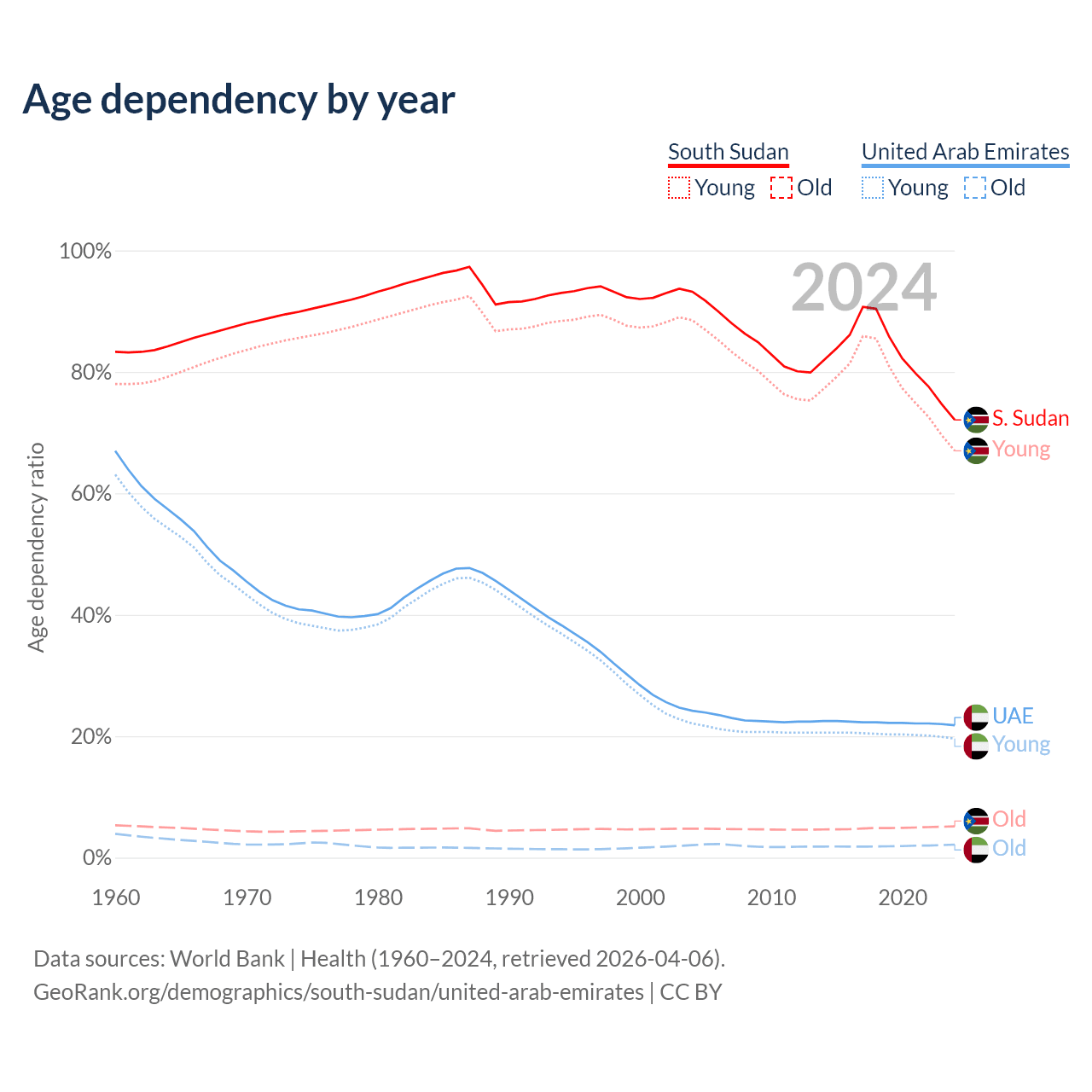 - The share of old-age demographic (65+) in South Sudan is 2.99% vs 1.77% in the United Arab Emirates.