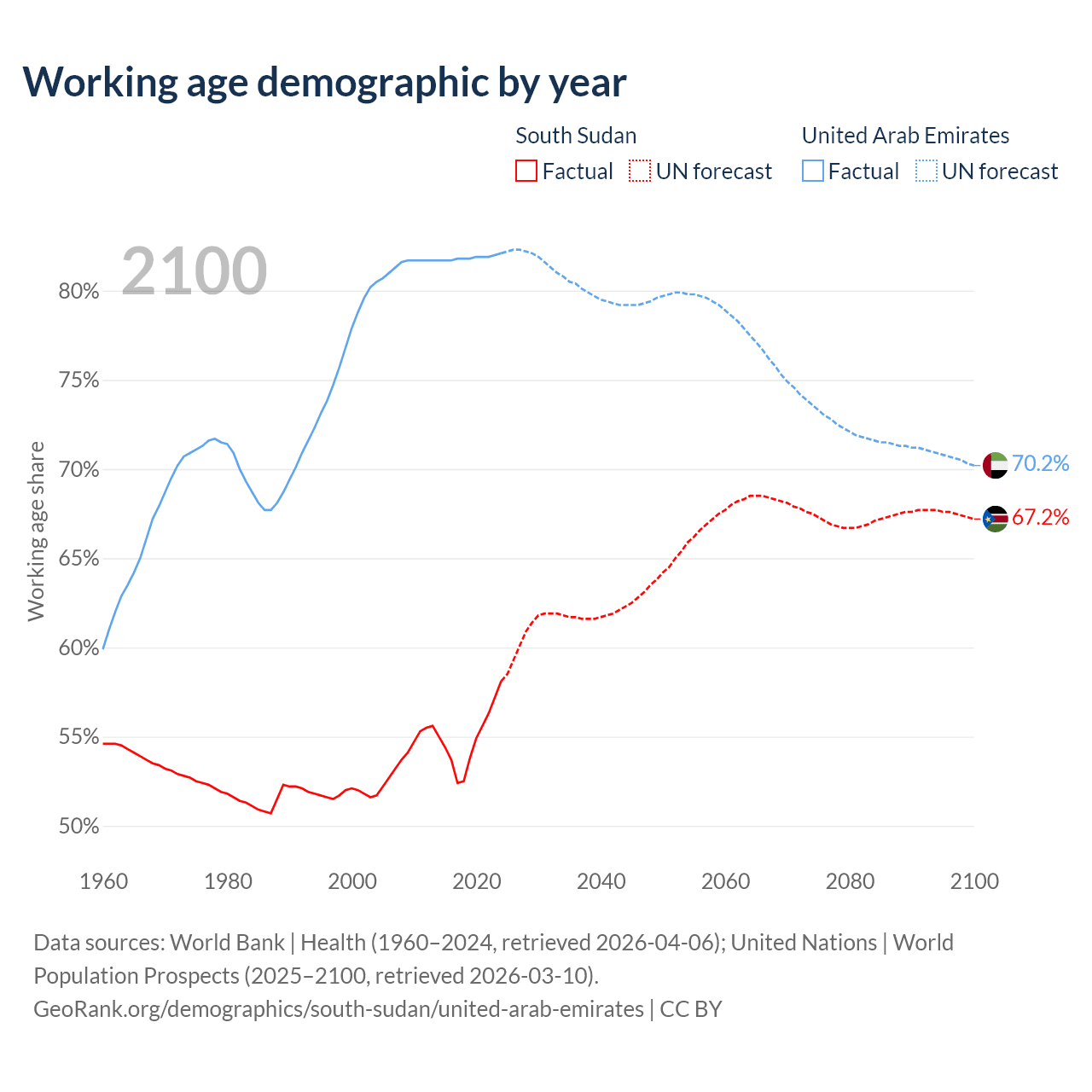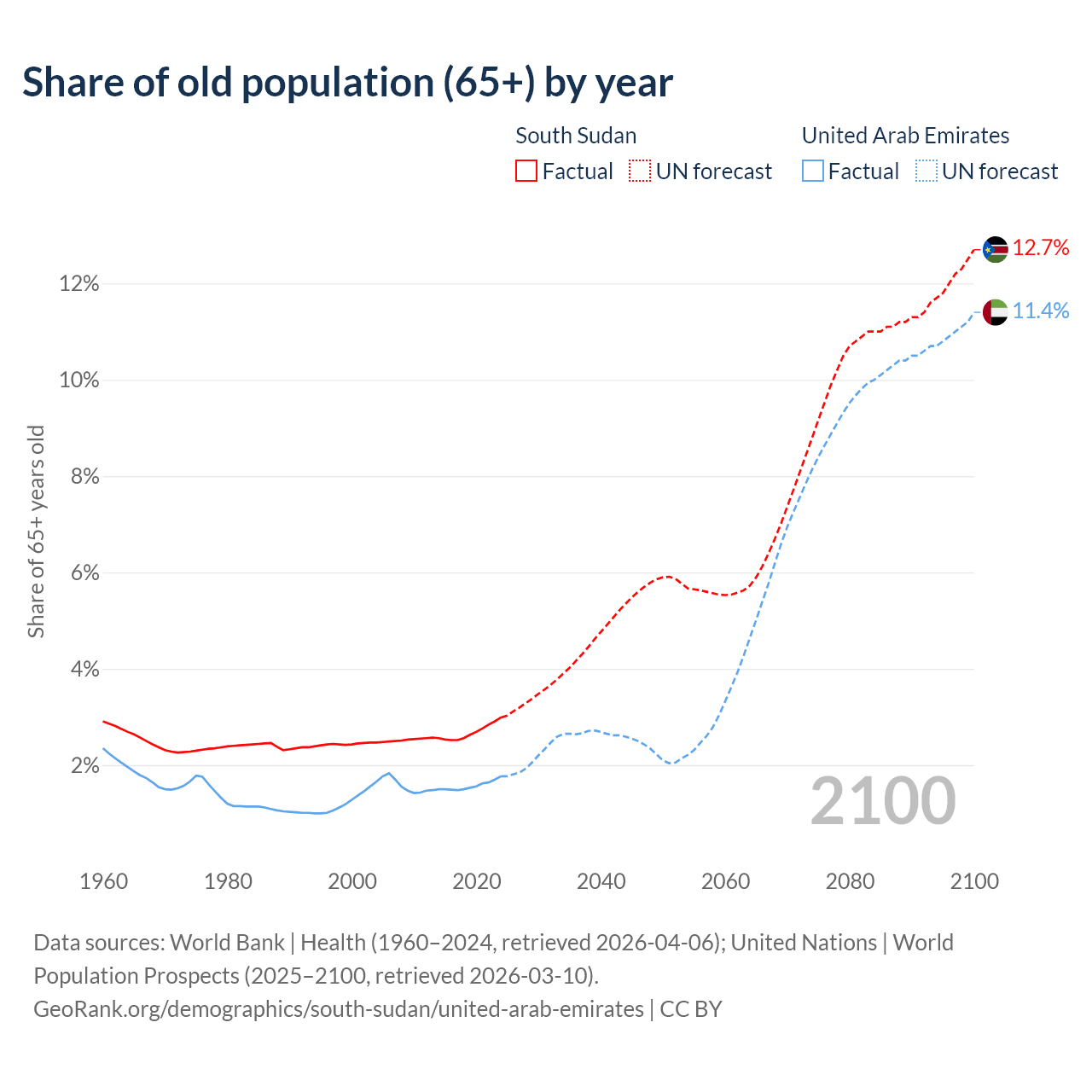 The share of older people aged 65 and over is 2.99% in South Sudan and 1.77% in the United Arab Emirates. Life expectancy in South Sudan compared to the United Arab Emirates .