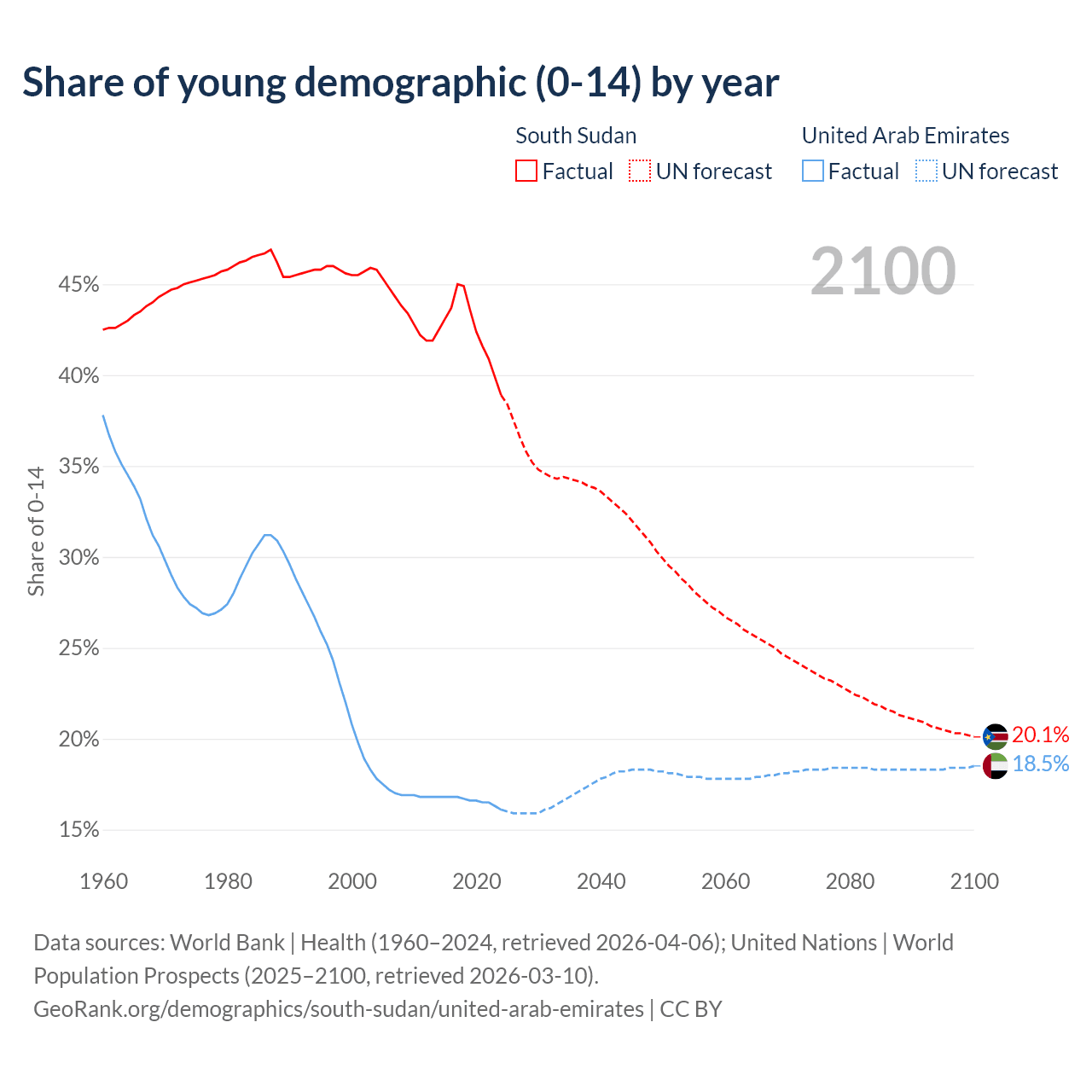 - The share of young demographic (0-15 years old) in South Sudan is 38.9% vs 16.1% in the United Arab Emirates.