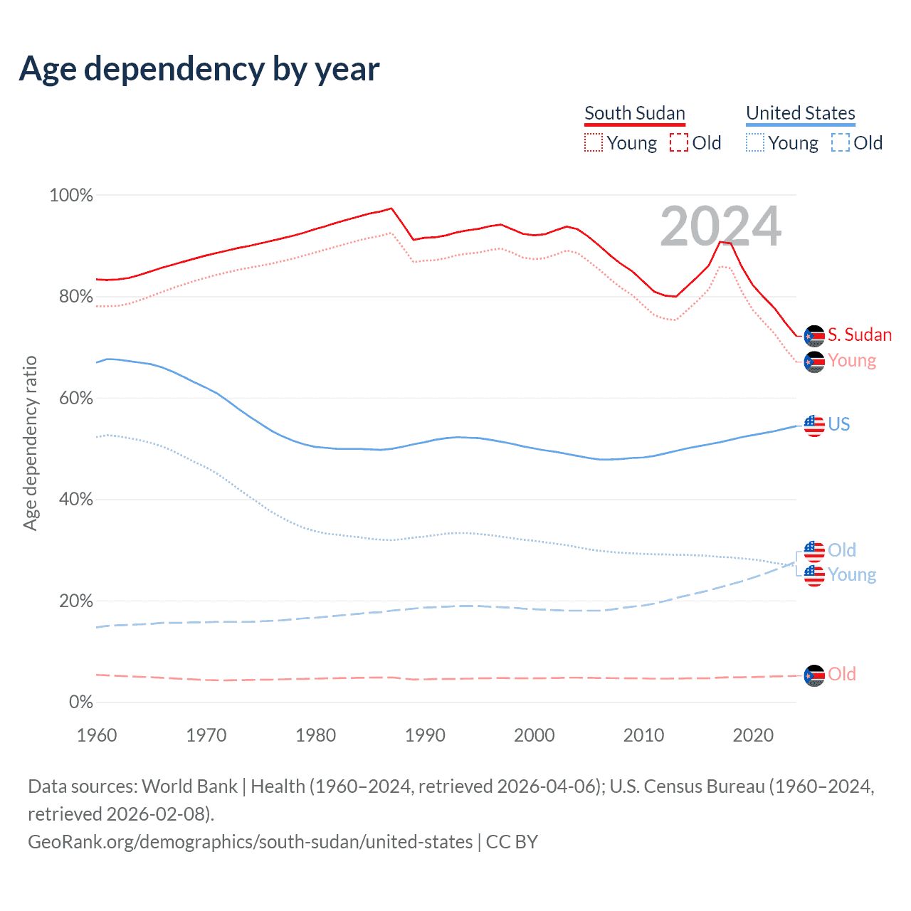 - The share of old-age demographic (65+) in South Sudan is 2.99% vs 17.9% in the United States.