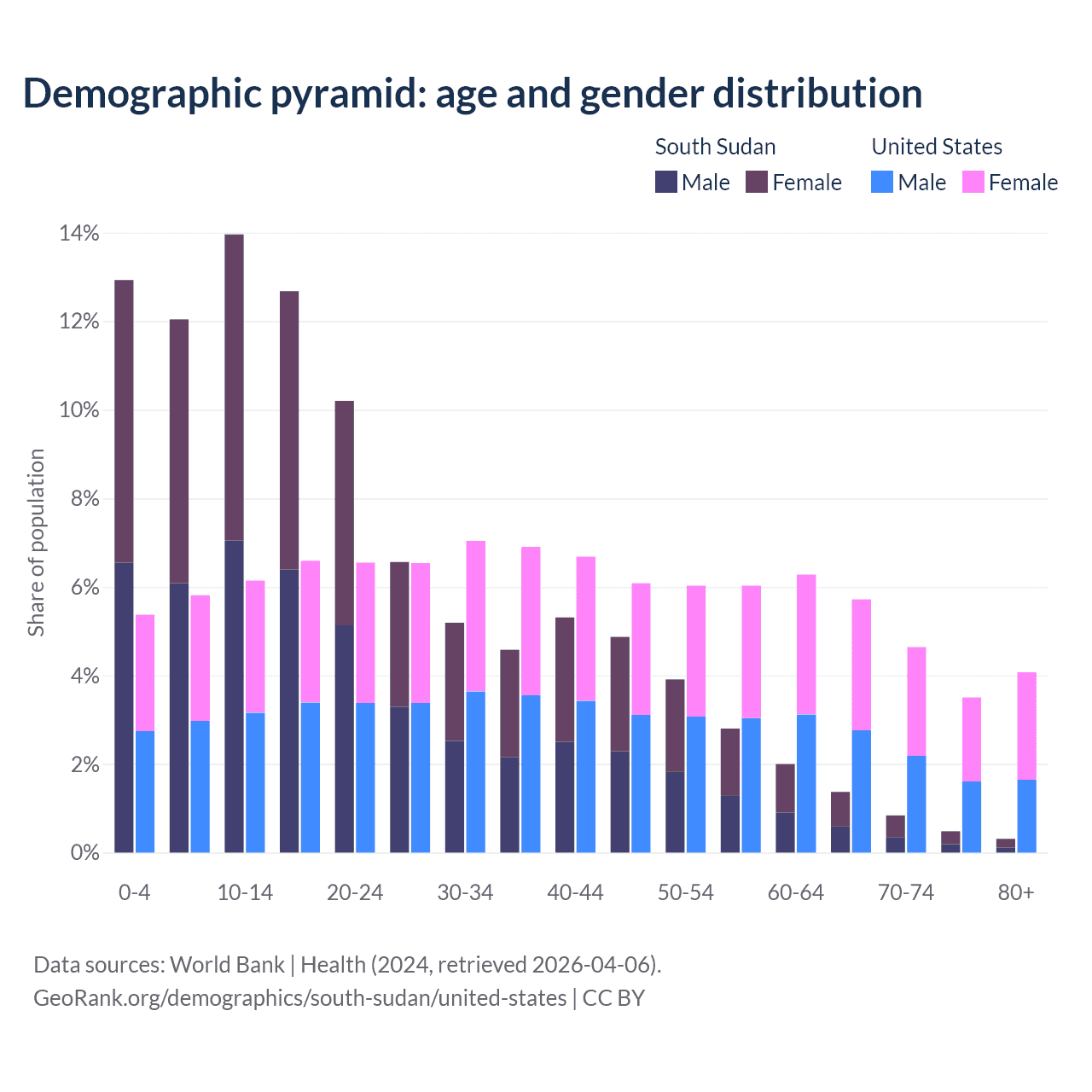 - South Sudan is ranked 173/196 by median age (oldest to youngest) vs 50/196 for the United States.