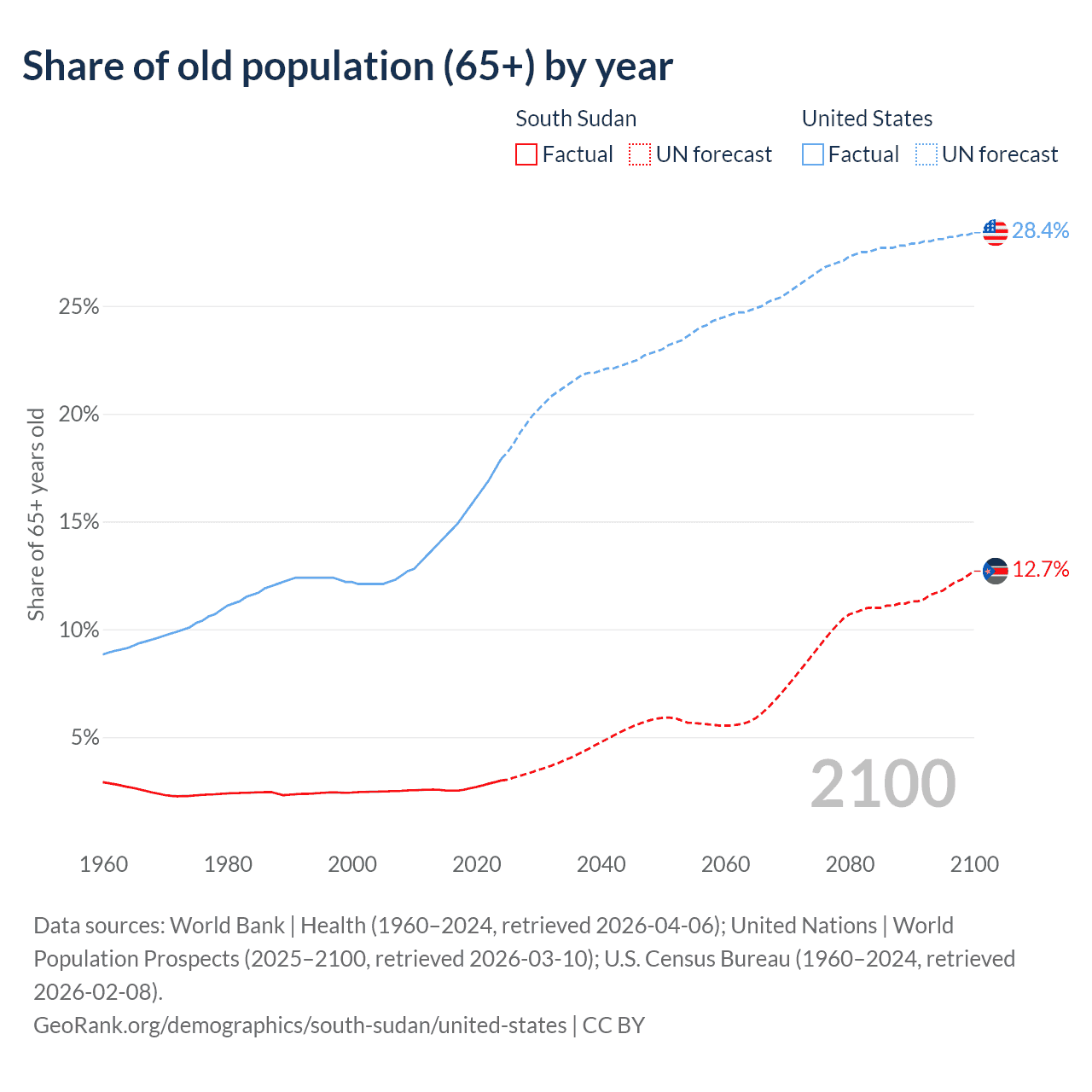 The share of older people aged 65 and over is 2.99% in South Sudan and 17.9% in the United States. Life expectancy in South Sudan compared to the United States .