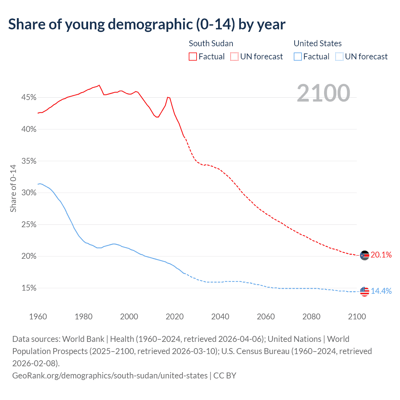 - The share of young demographic (0-15 years old) in South Sudan is 38.9% vs 17.3% in the United States.